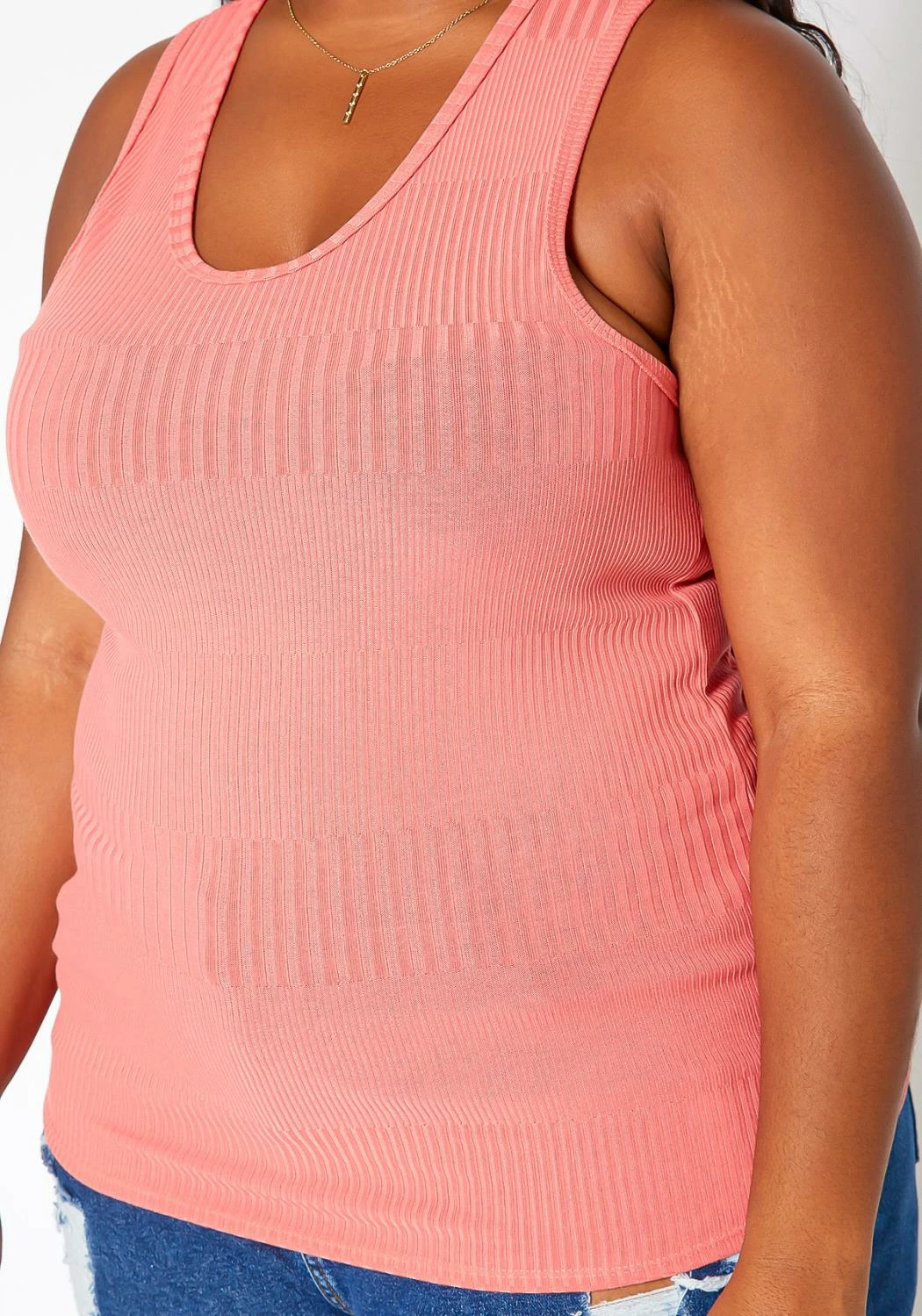 Basic plus size women’s tank top in ribbed material, scoop neck style and racerback design.