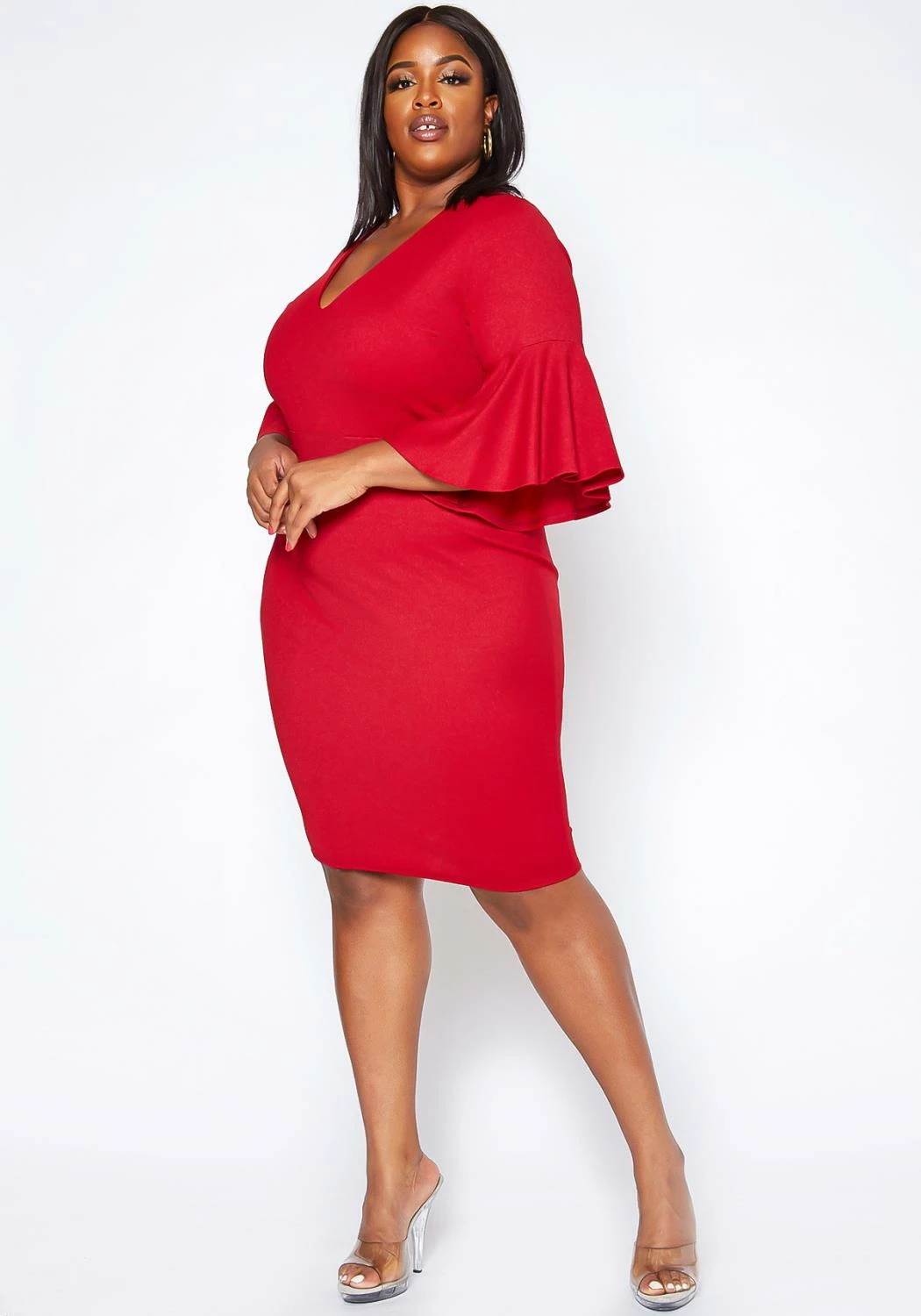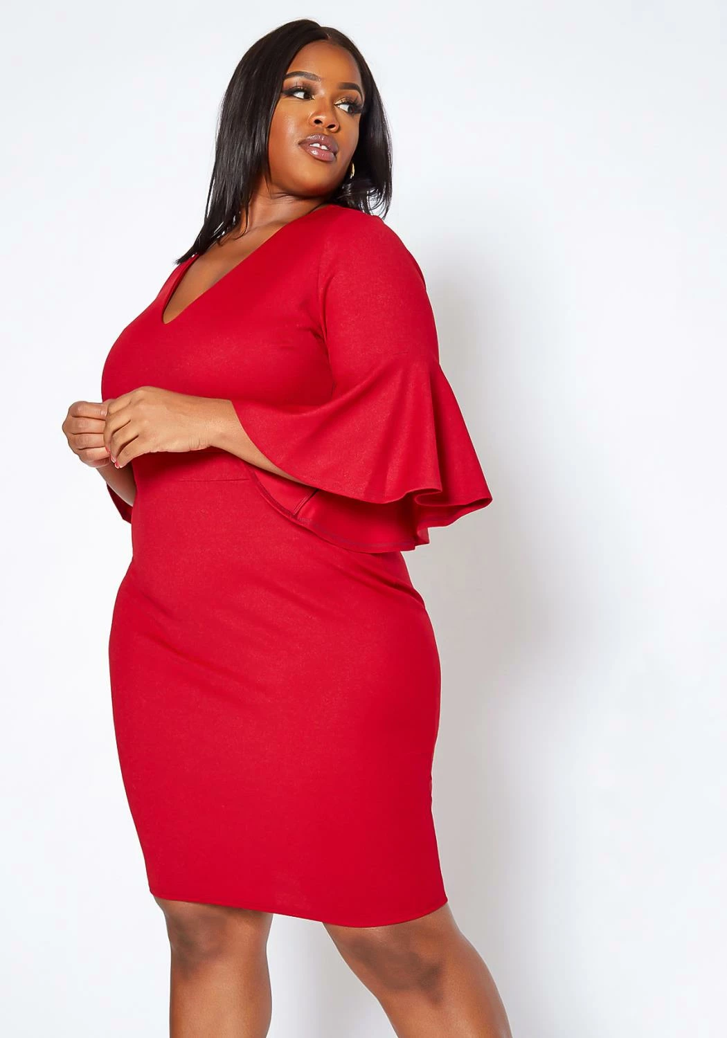 Plus size women’s elegant mini dress in v-neck style, bell flare short sleeves and bodycon fit.