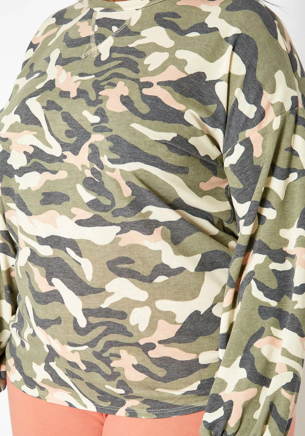 Plus size women’s casual camo print statement sweater in crew neck style, loose long sleeves, fitted wrist cuffs and triangle stitch hem.