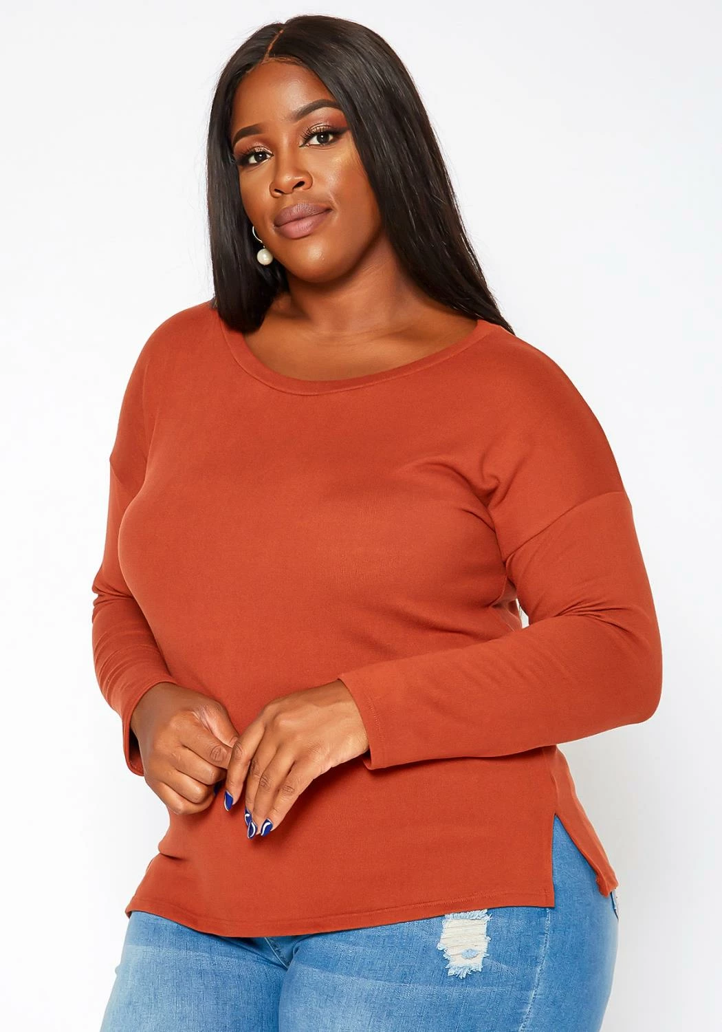 Plus size women’s essential long sleeve top in casual crew neck style, slim fit and side slit hem design.
