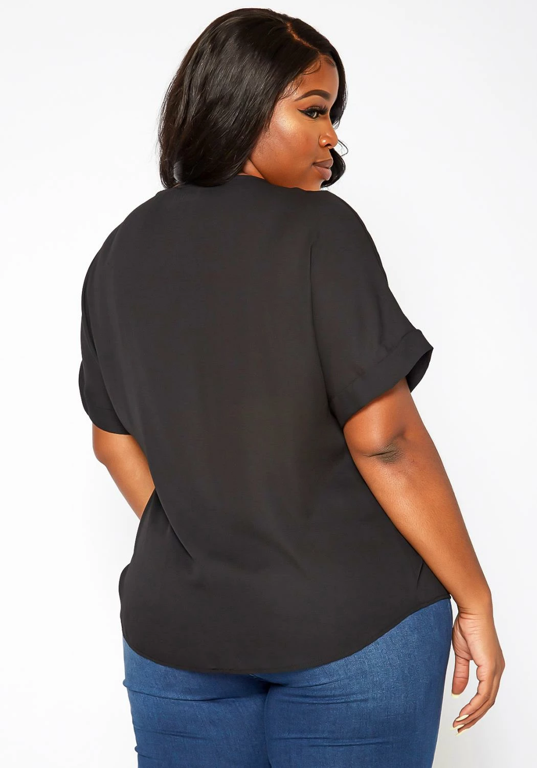 Classy plus size women’s blouse with chainlink ascent, round neck style and short sleeves.