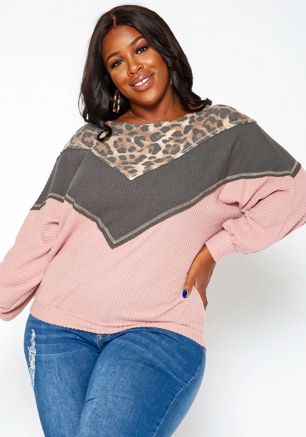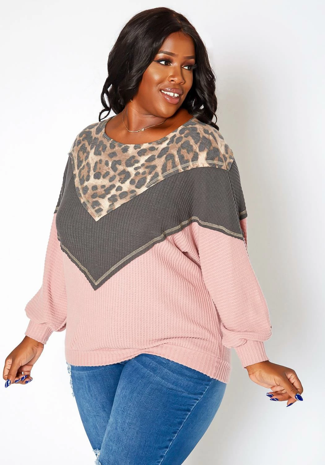 Lightweight knit sweater for plus size women in waffle knit, color block design, round neck style and drop shoulder long sleeves with fitted wrist cuffs.