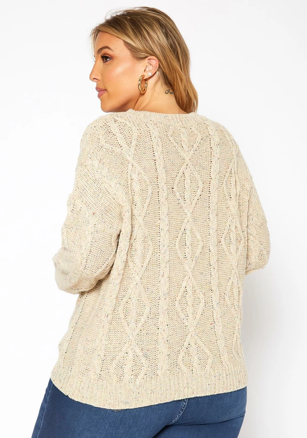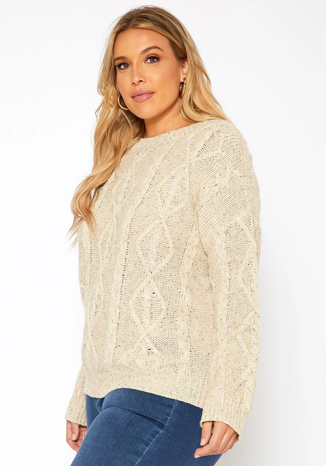 Winter starter cable knit sweater for plus size women with color hinted details, crew neck style and comfy long sleeves.