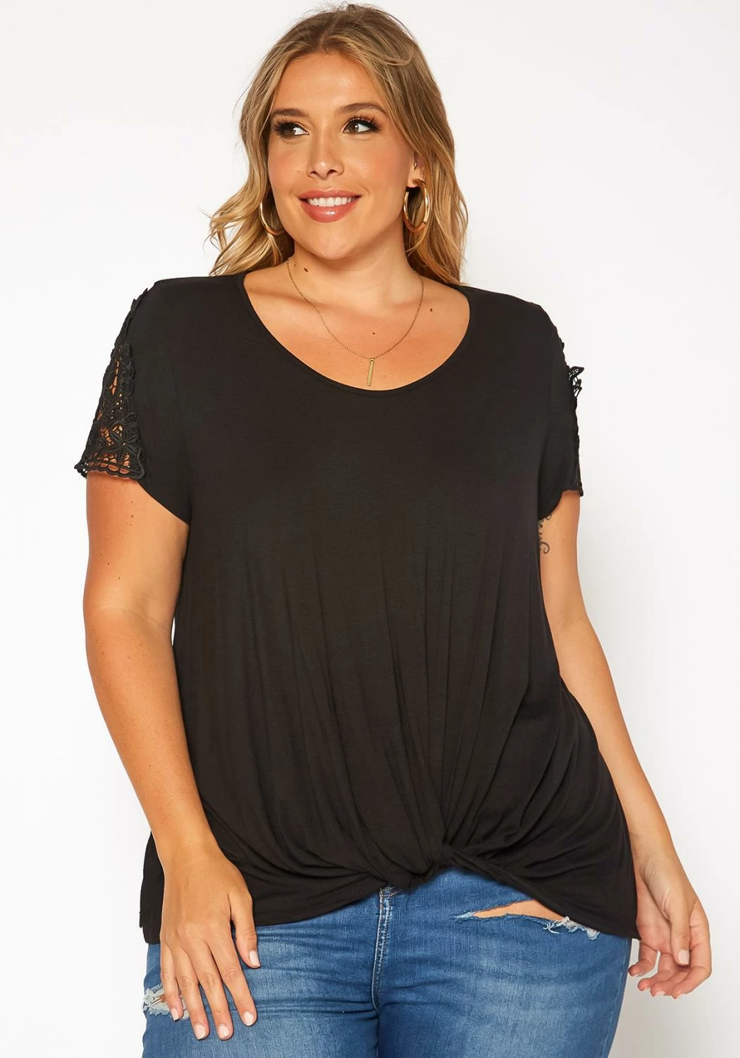 Basic plus size women’s t-shirt with crochet hem on the short sleeves, round neck style and drape front knot hem.