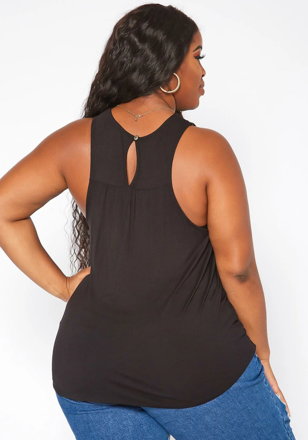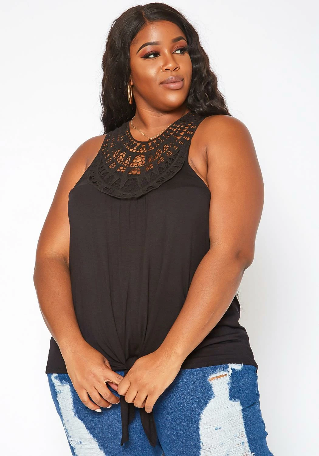 Plus size women’s upleveled basic tank top with crochet hem design, tassel front tie ascent and sleeveless style.