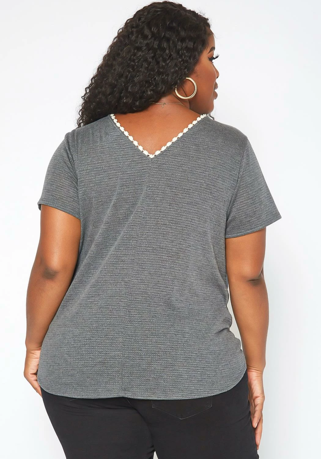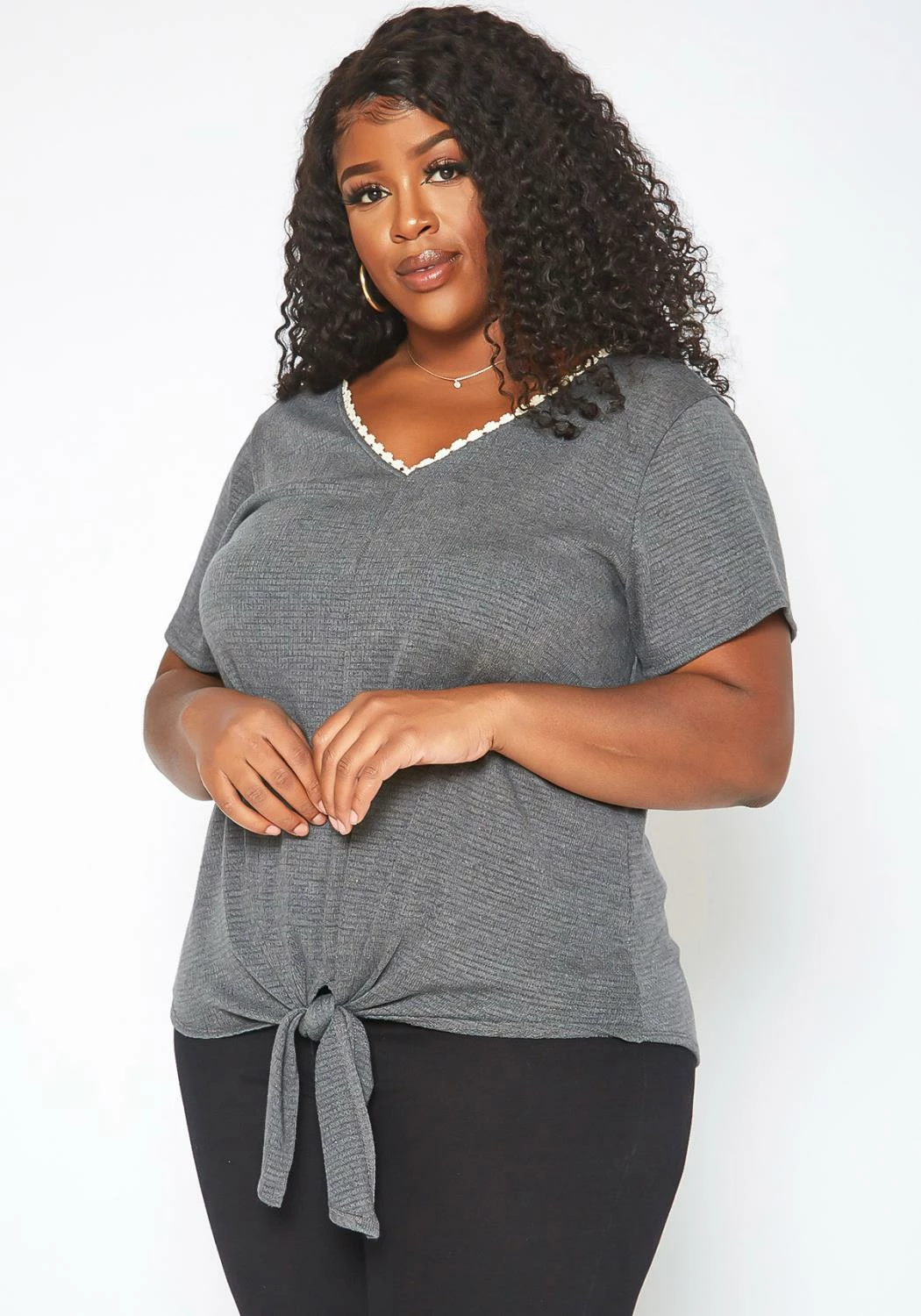 Casual yet stylish plus size women’s basic t-shirt in ribbed material, v-neck style, crochet trim, short sleeves and front tassel tie ascent.