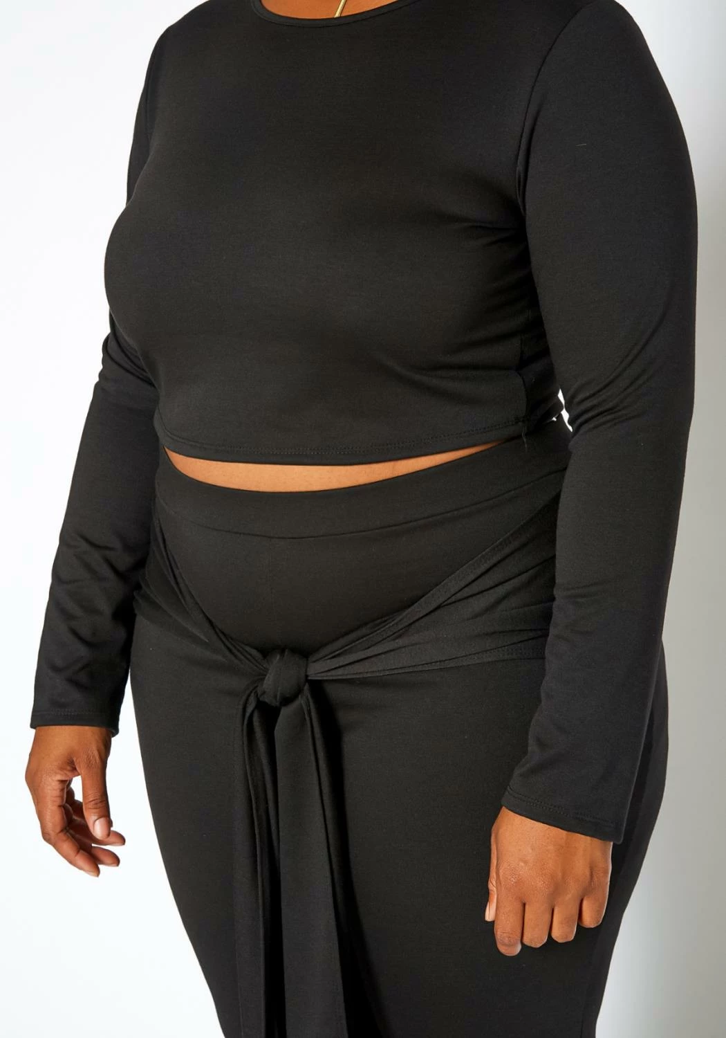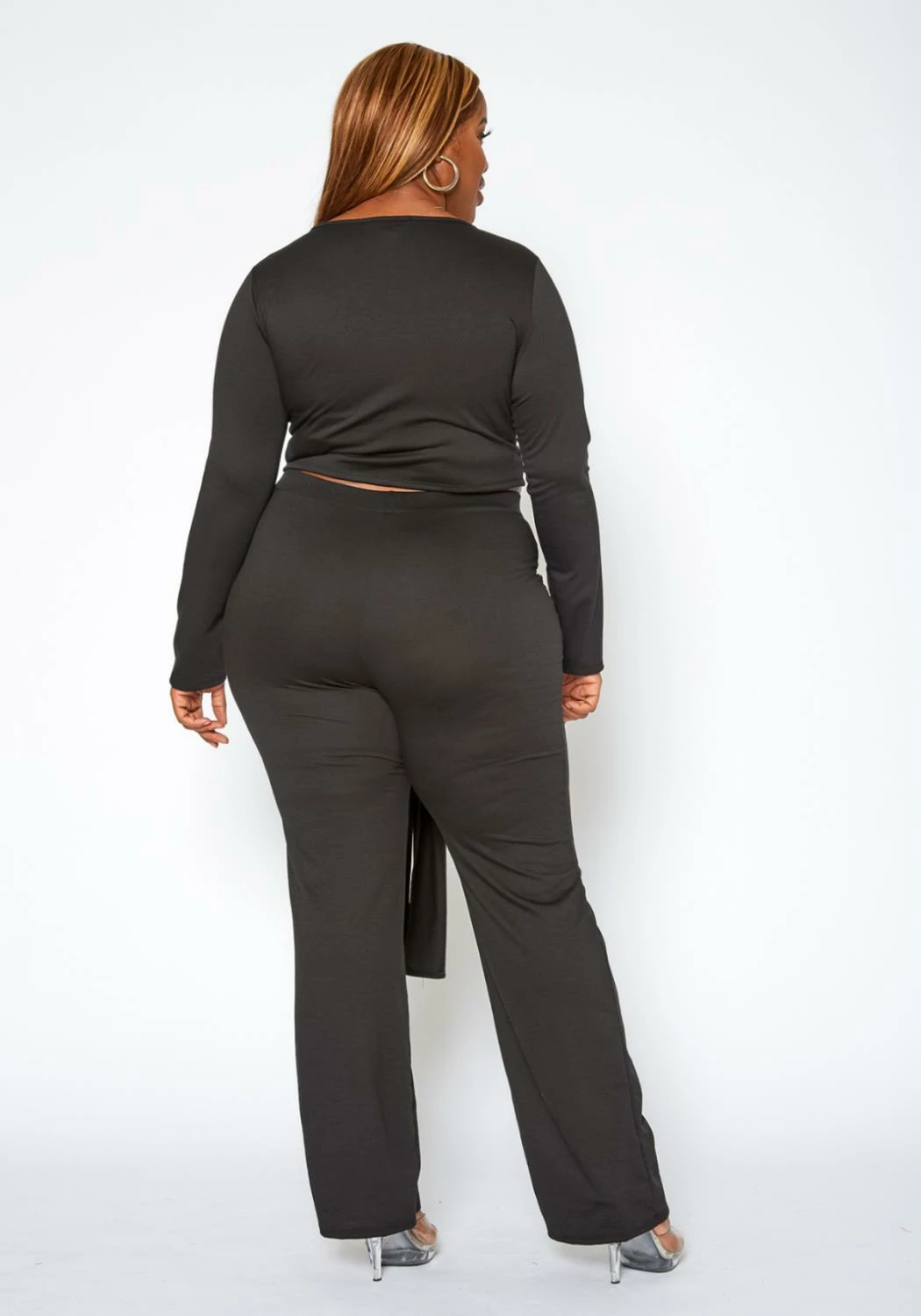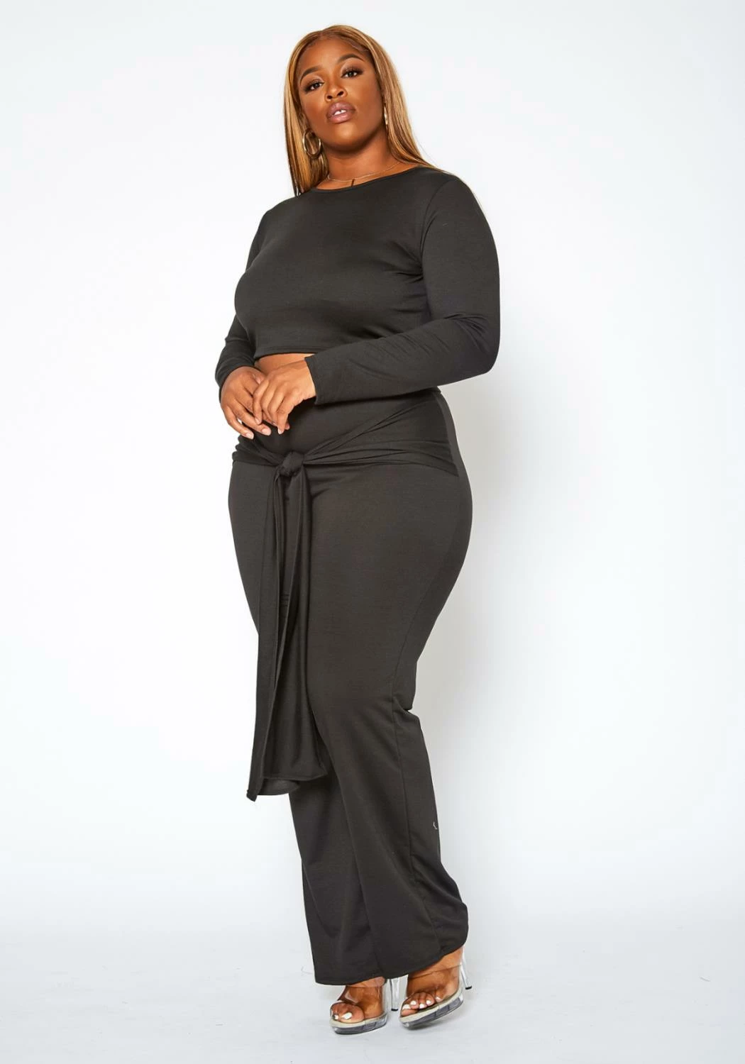 Stylish solid color matching set for plus size women which features a cropped crew neck sweater and high waist flare leg pants with belted design.