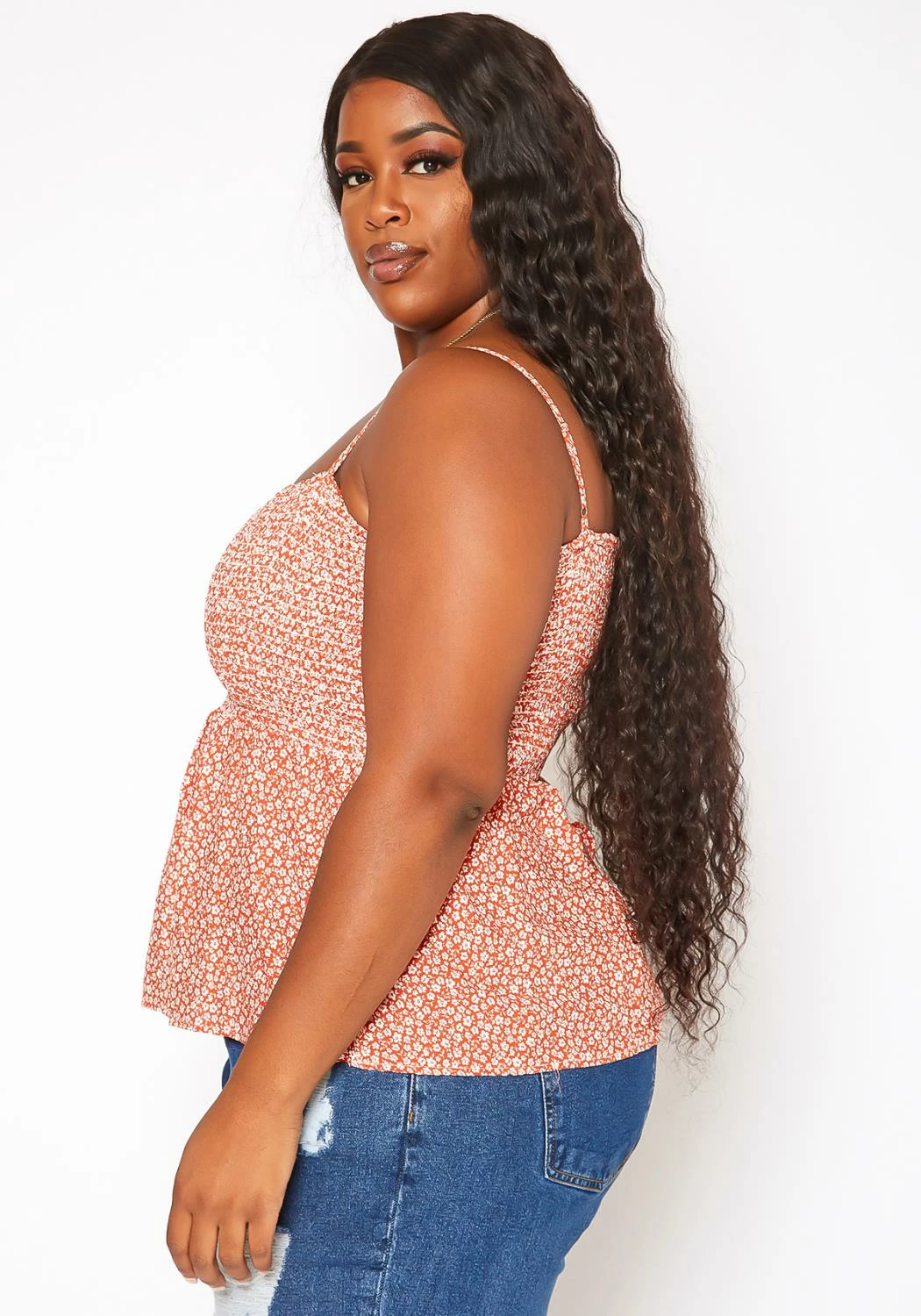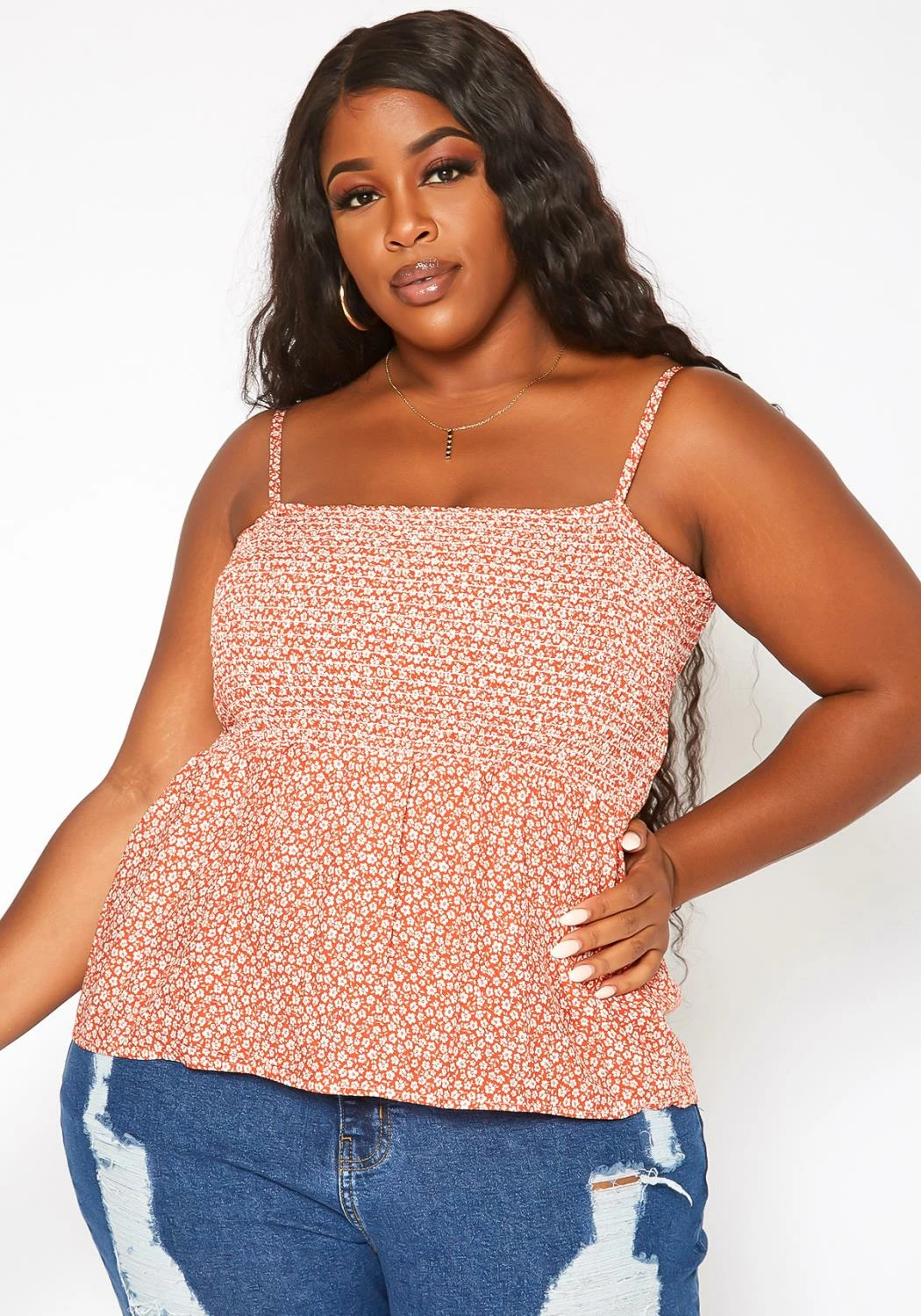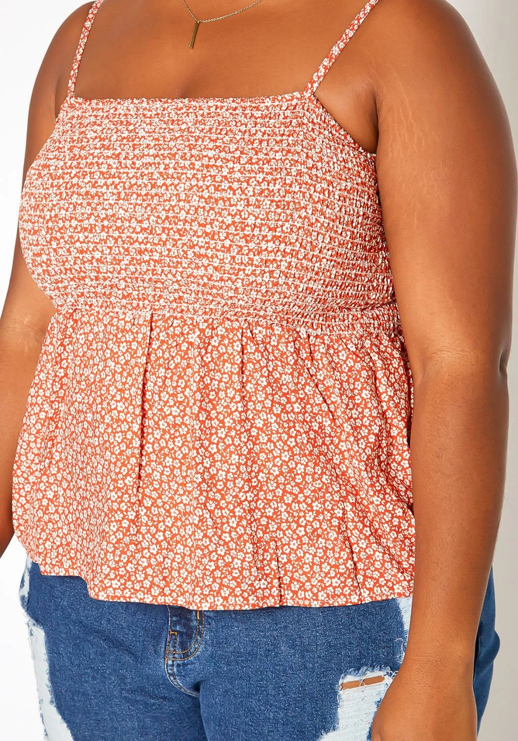 Lovely spring top in dainty floral print, square neck style, peplum flare, smocked hem and adjustable cami shoulder straps.