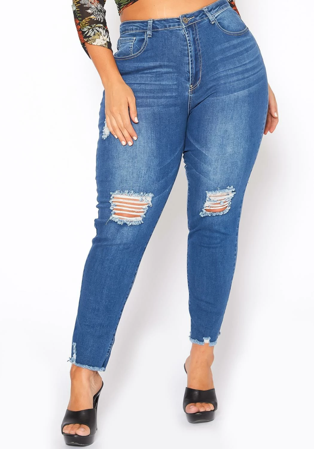 Lovable plus size women’s skinny denim jeans in high rise style, knee distress, ankle hem distress, belt loop holes and pockets.