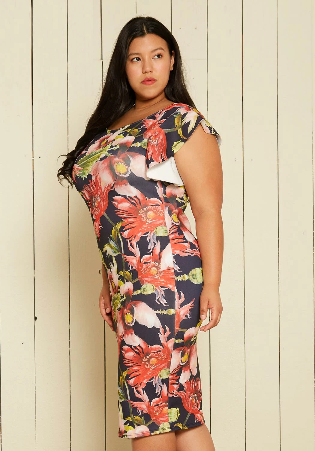 A lush floral print bodycon dress with flutter sleeves, every plus size person should have in their closet!