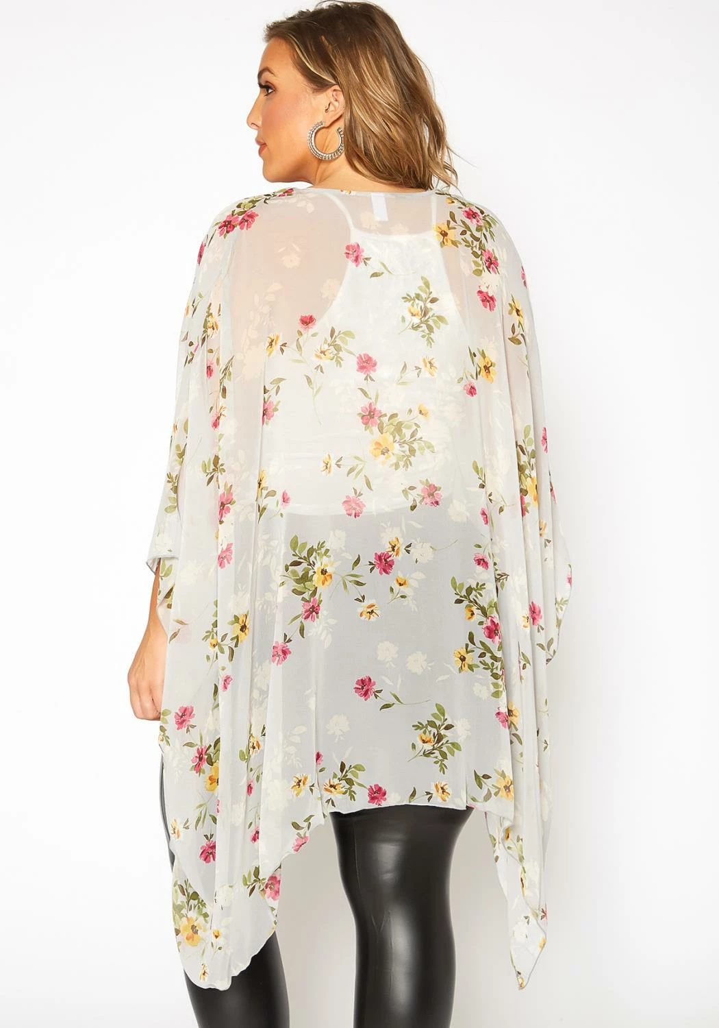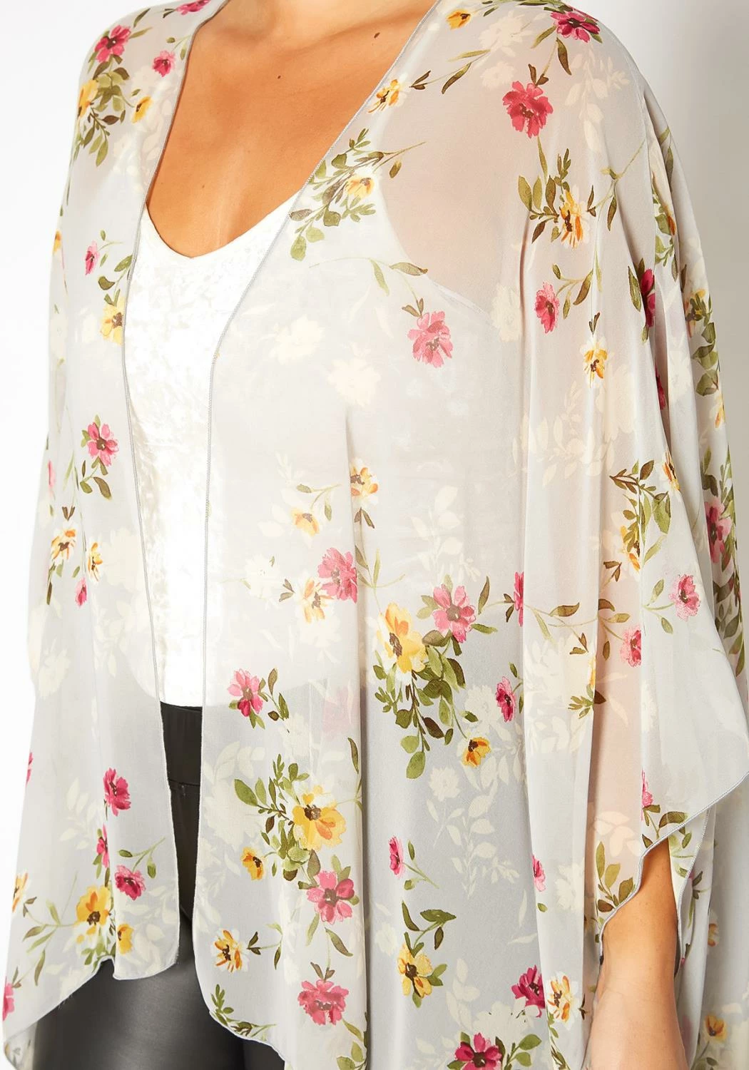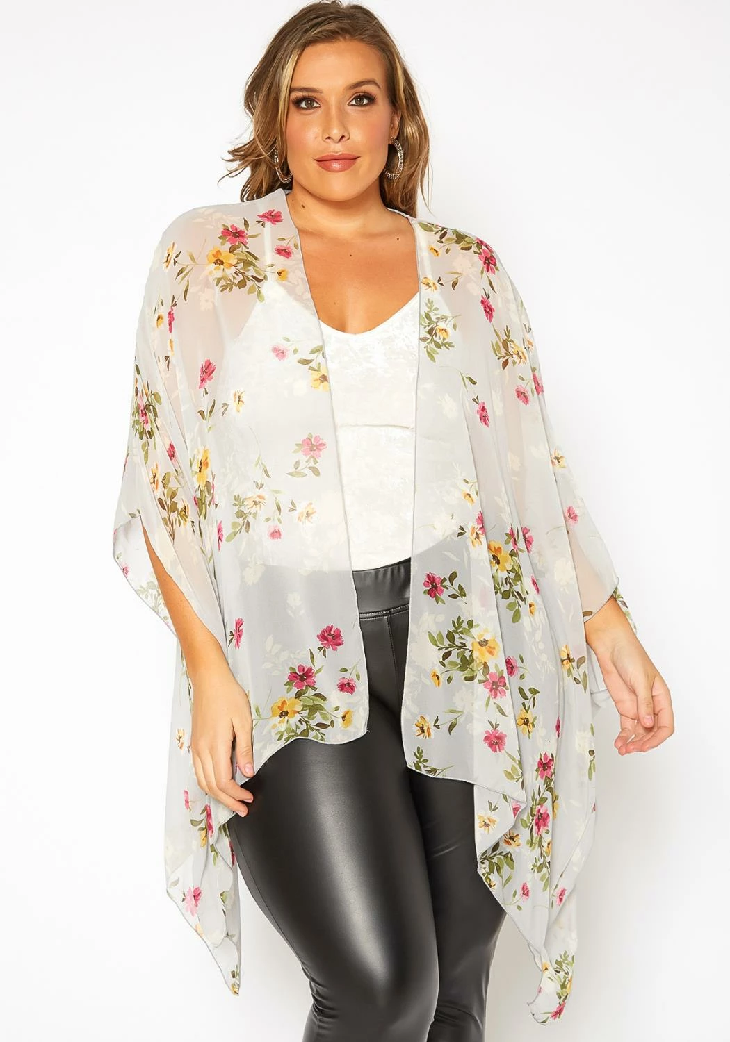 Lovely plus size women’s floral print kimono cardigan in open front style, dolman short sleeves and asymmetric flare hem.