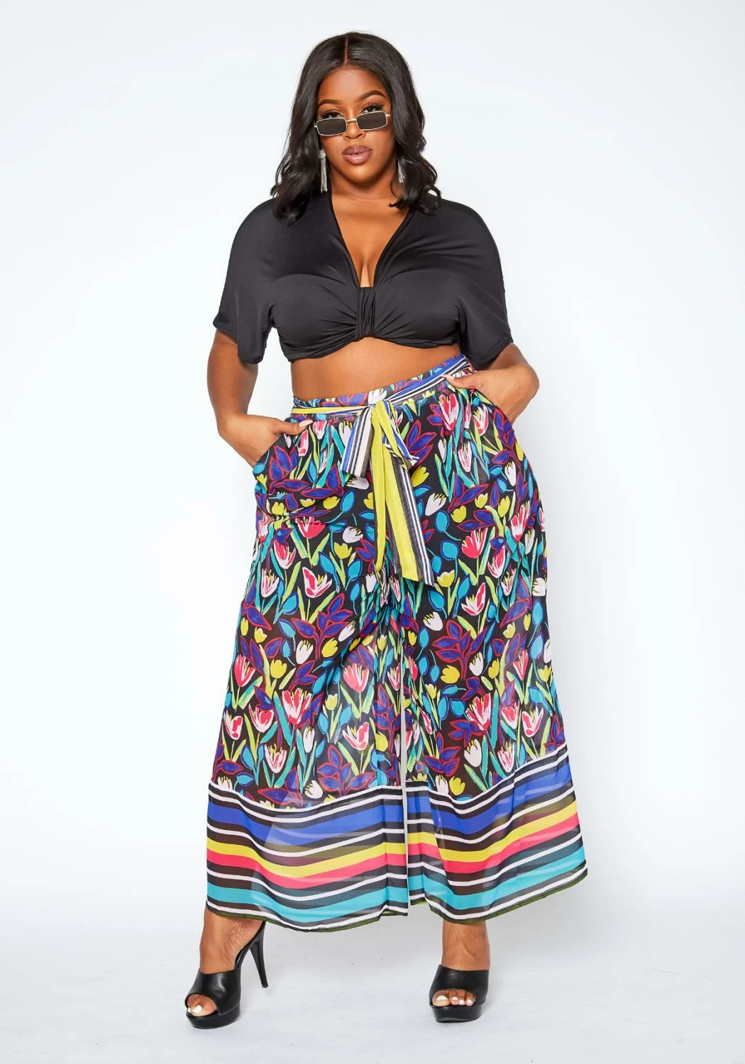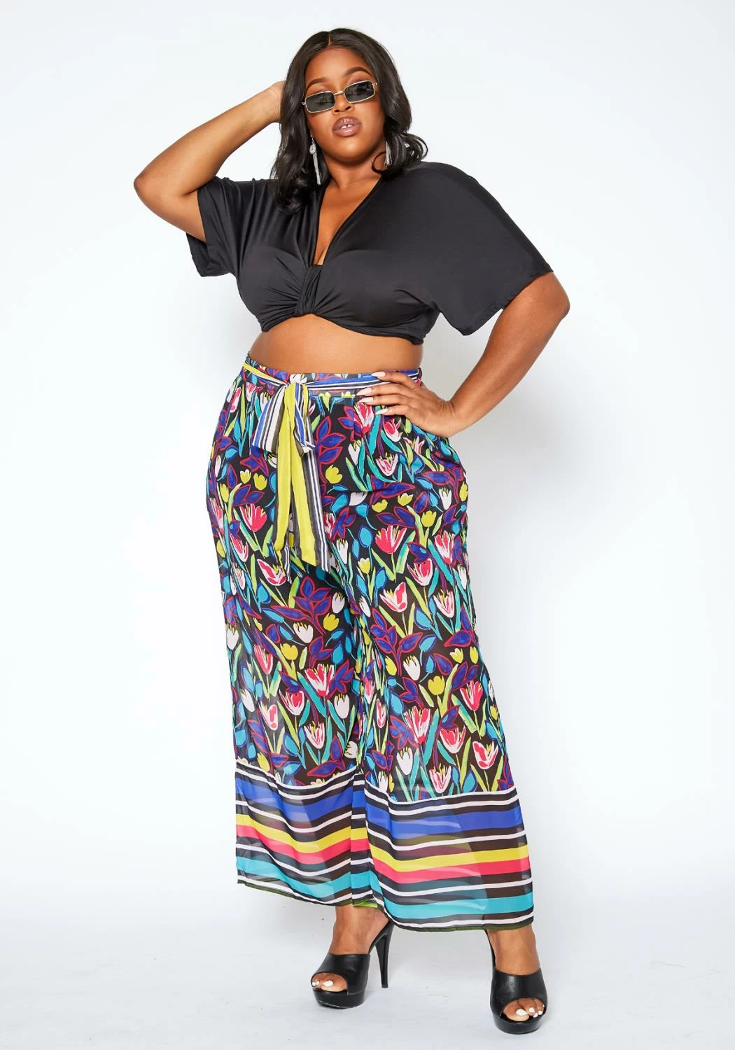 Lovely plus size women’s pants in floral print design, high rise style, straight leg hem and matching waist tie.