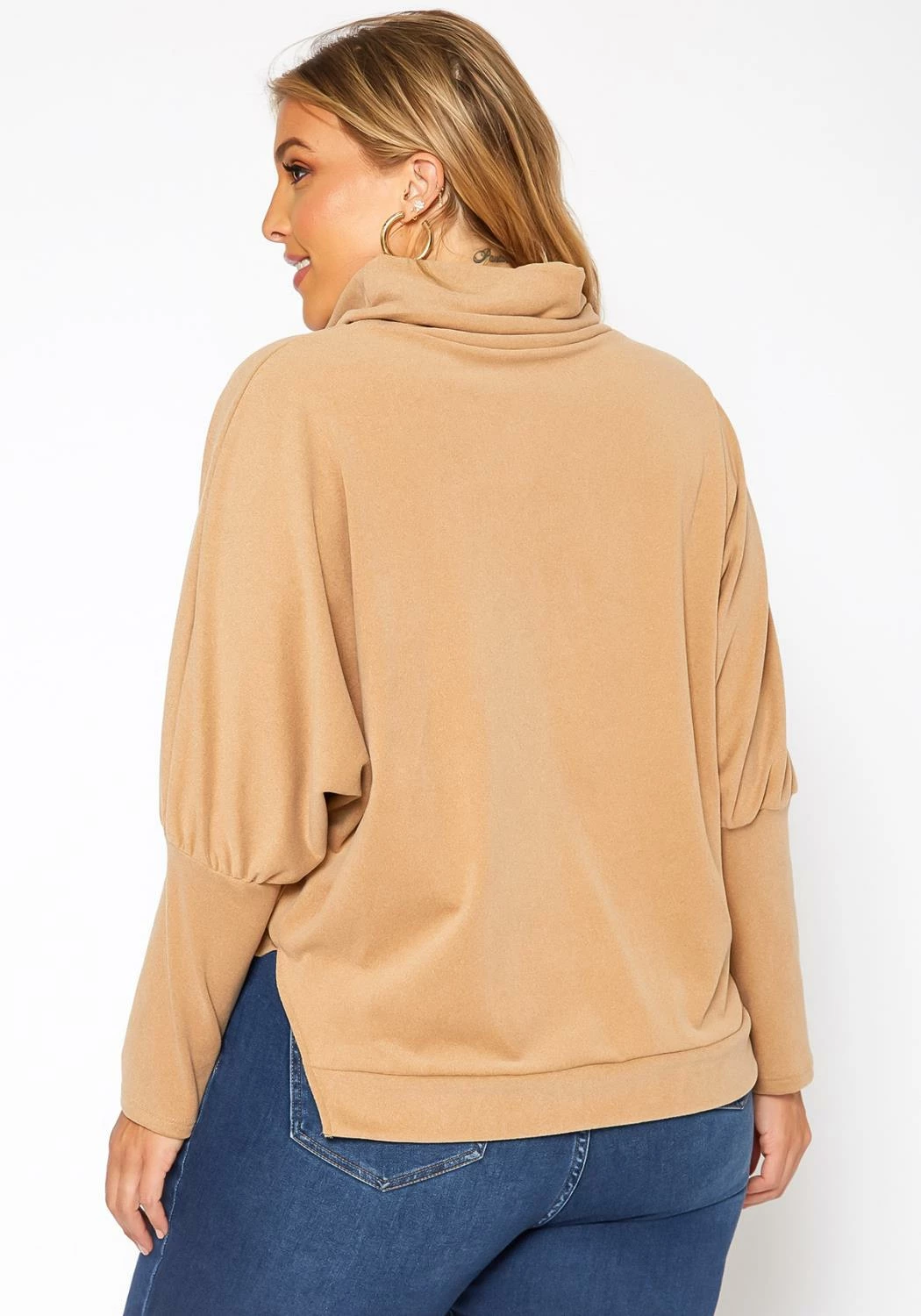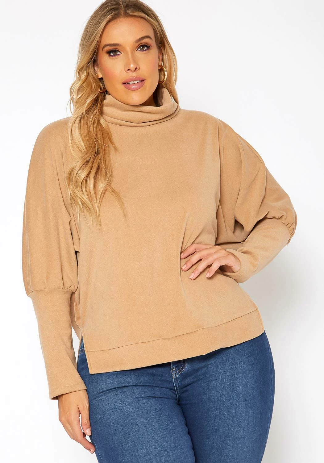 Cozy and stylish plus size women’s knit sweater in funnel neck style, side slit hem and loose to fitted long sleeves.