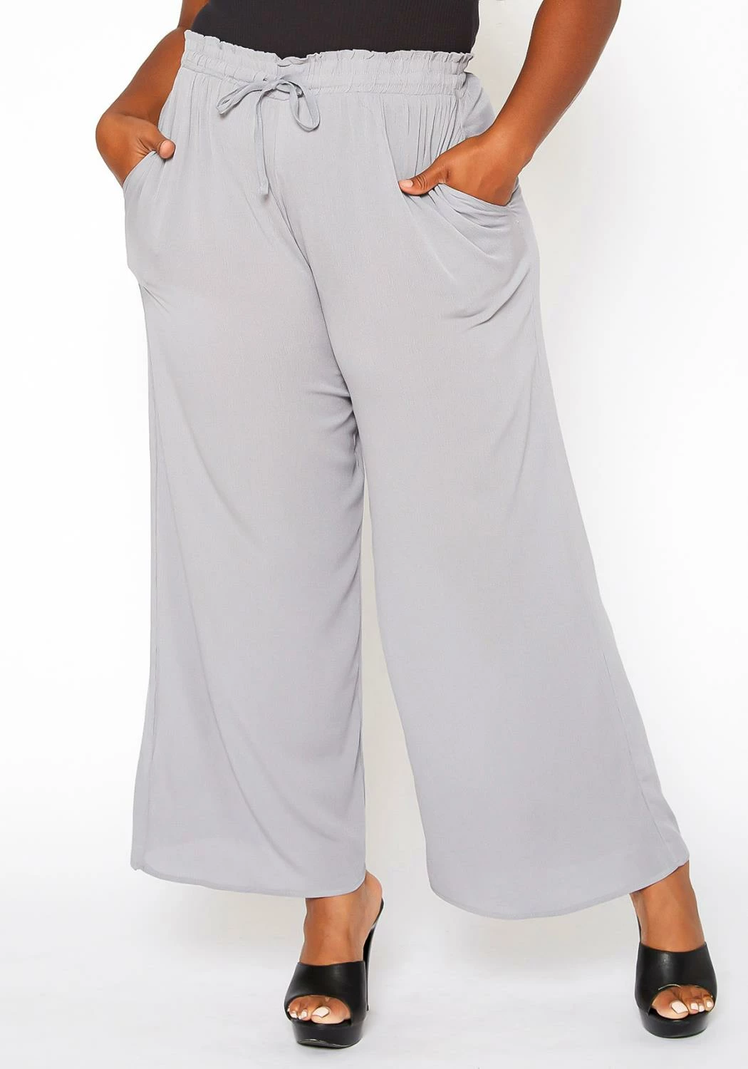 Casual palazzo pants in lightweight semi-sheer material, drawstring waistline, pocket ascent and straight leg fitting.