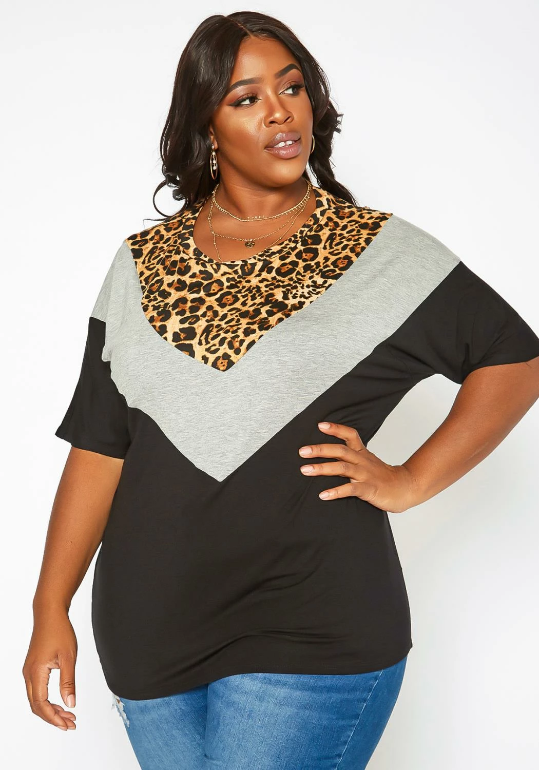 Casual plus size women’s t-shirt with leopard print design, chevron splice design, v-neck style, hip length and dolman short sleeves.