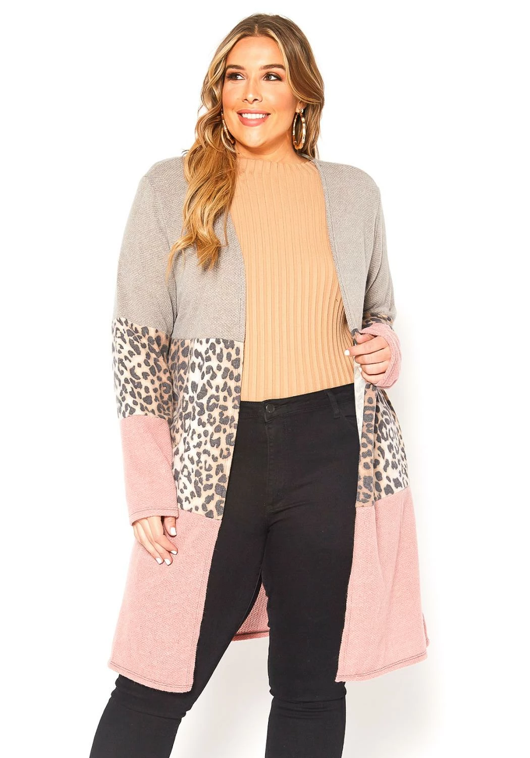 Plus size women’s cute and cozy cardigan in long knee length, open front style and leopard print / color block design.