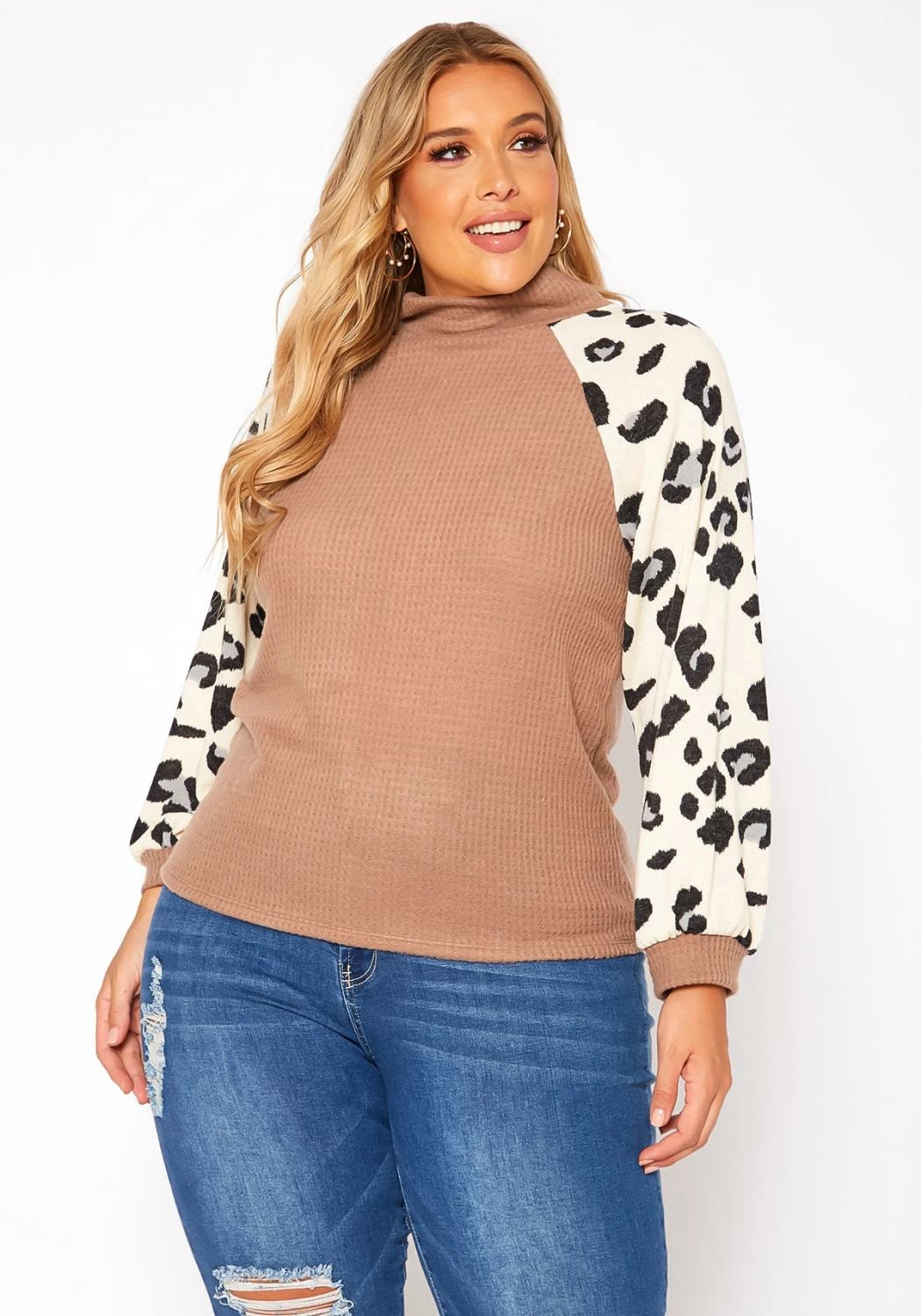 Cozy plus size women’s knit sweater in leopard print long sleeves, high neck style and waffle knit material.