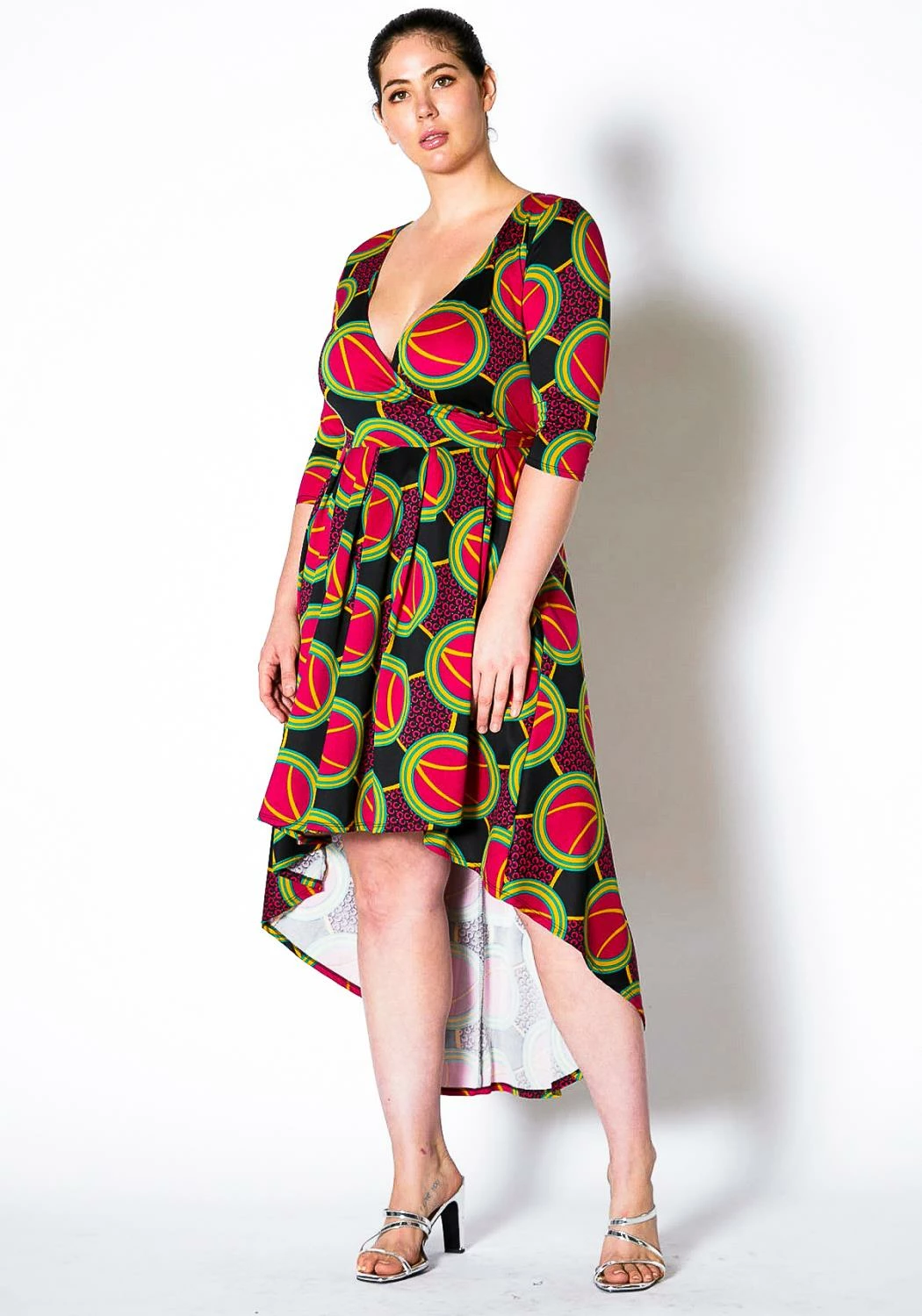 Plus size women’s multi color printed high low hem dress with pleated fold.
