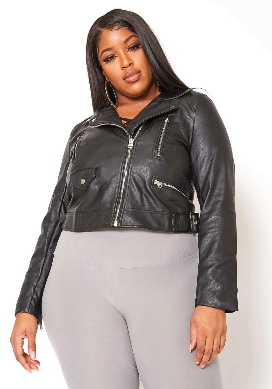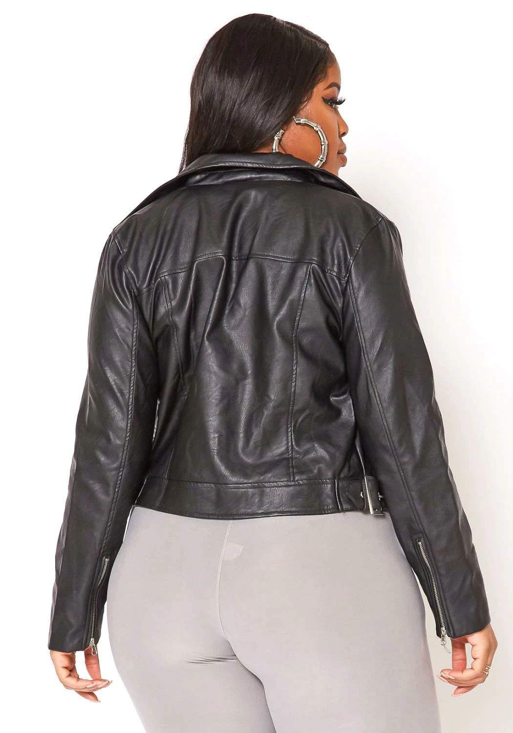 An everyday layer throw on essential faux leather jacket which features a notch collar, zipper ascents and a front zipper closure.