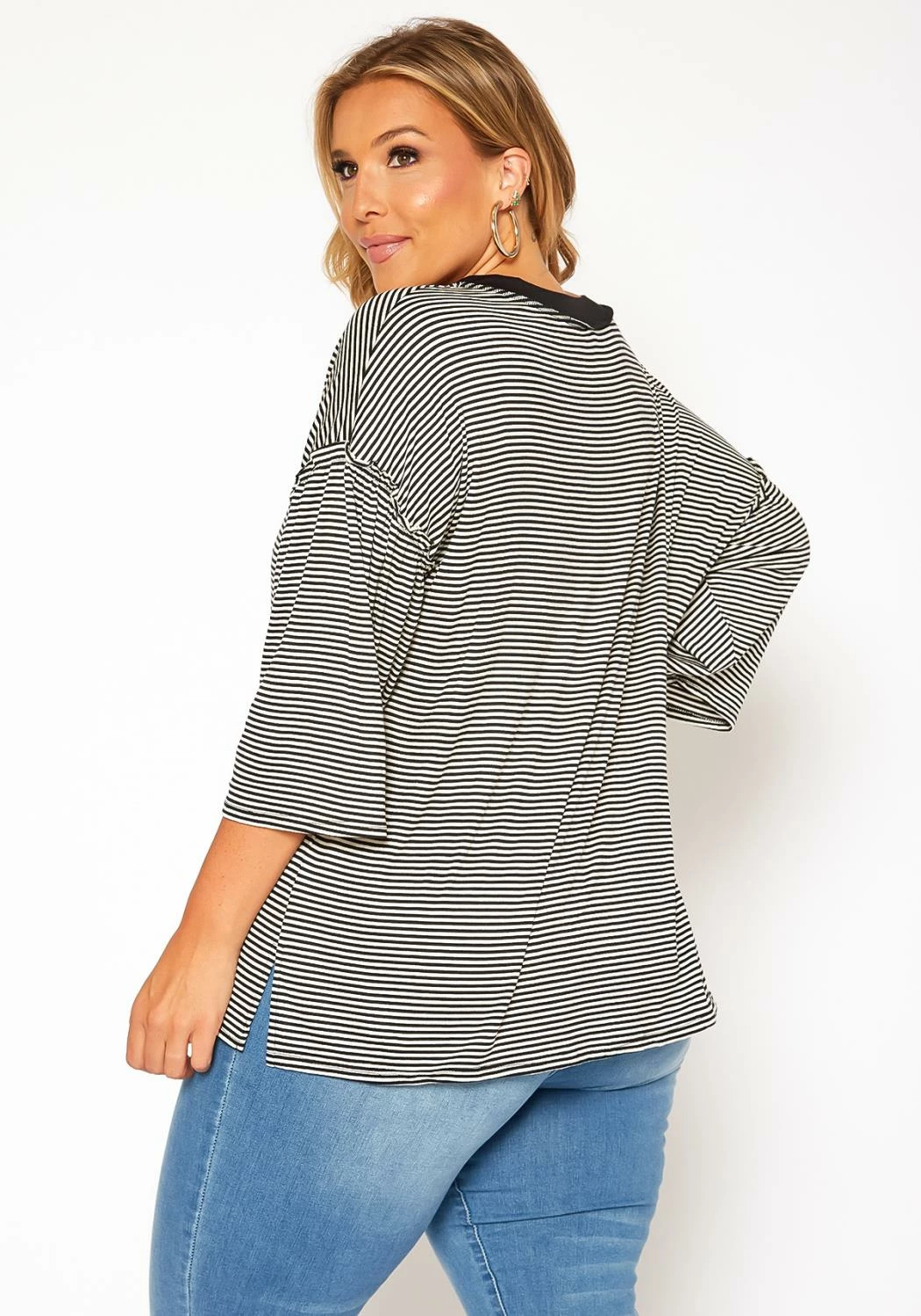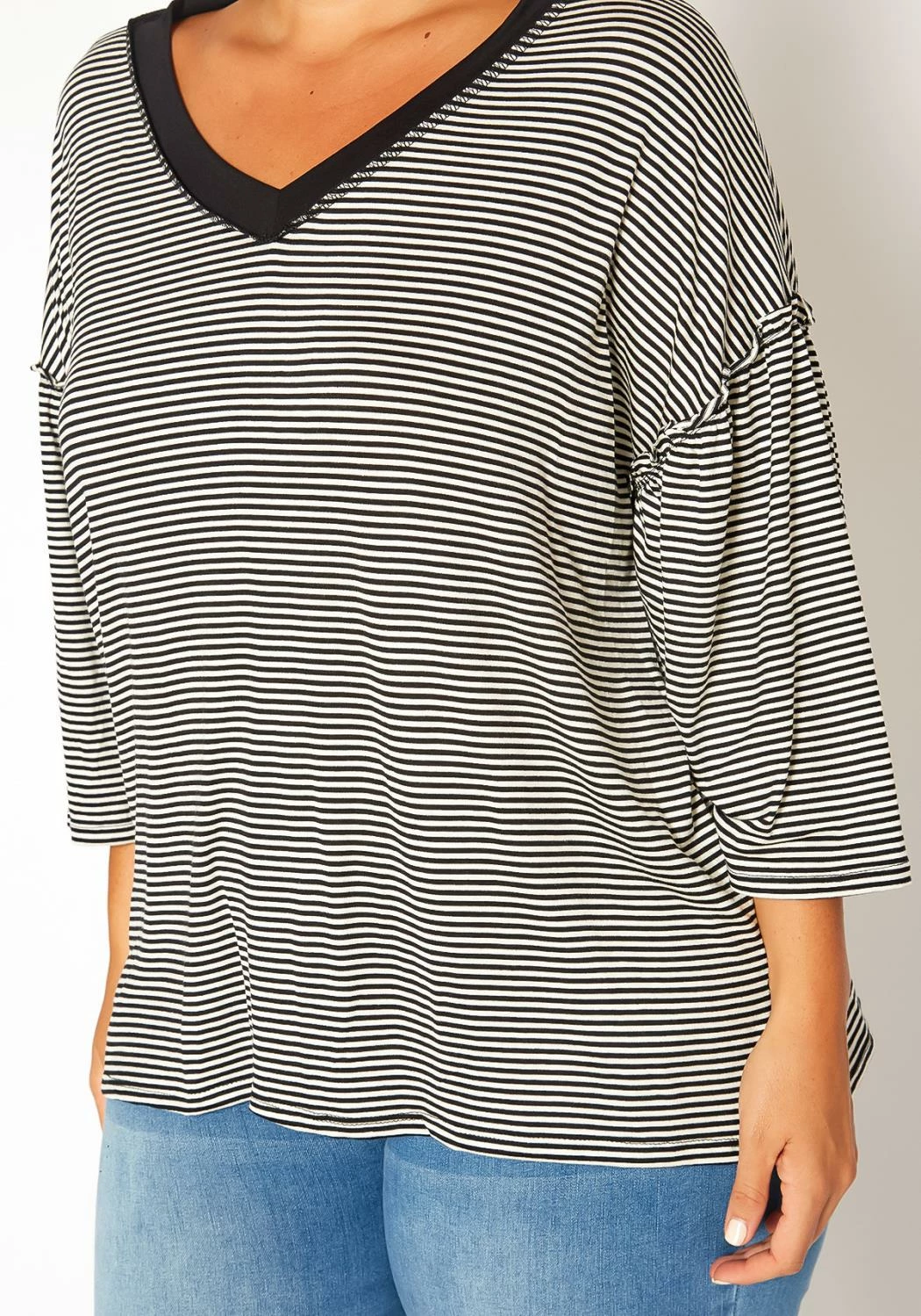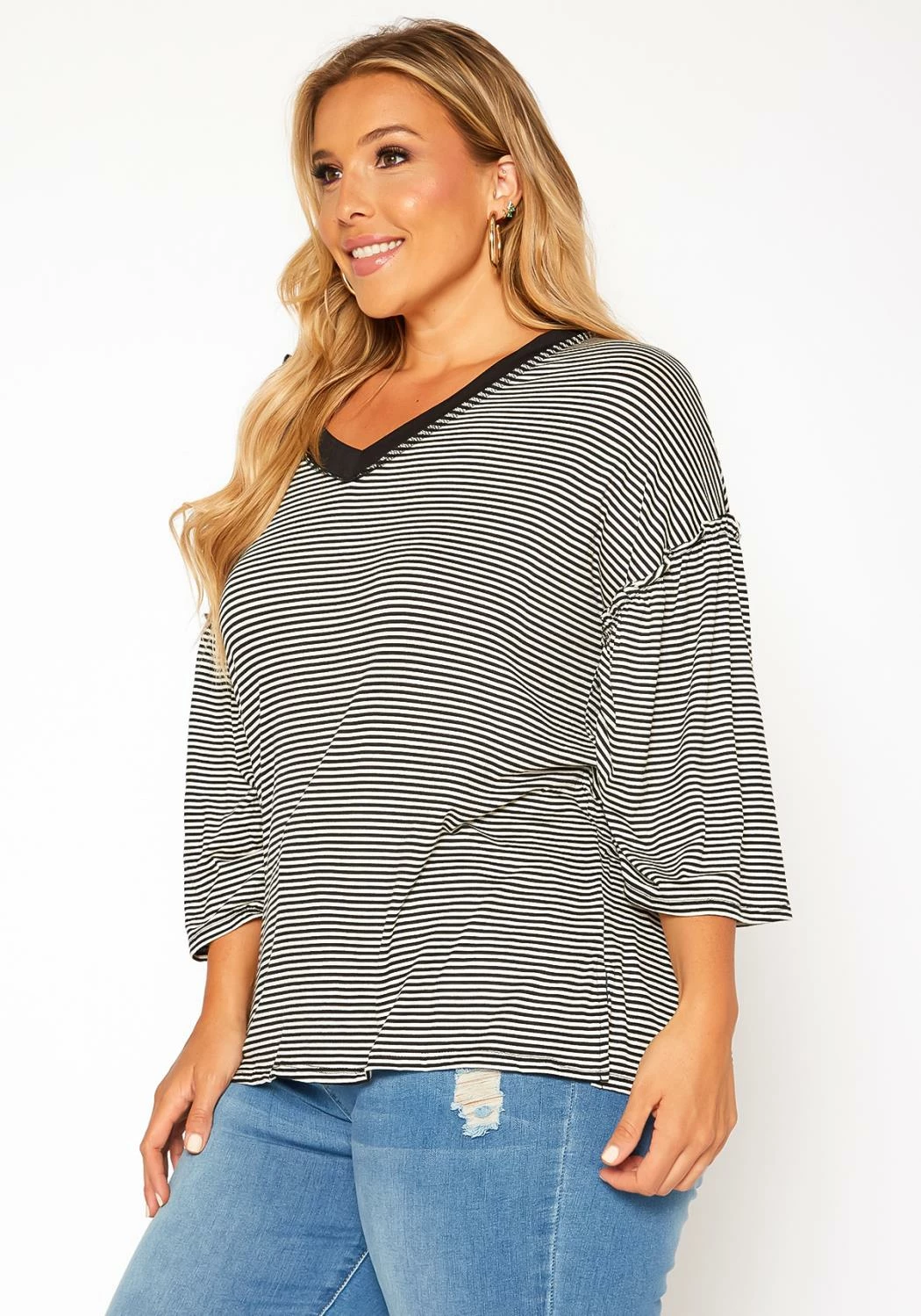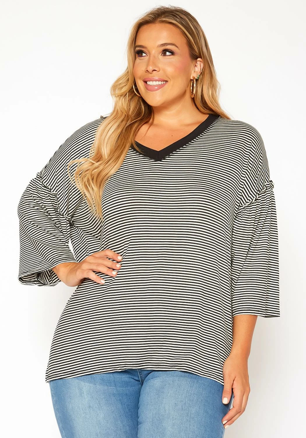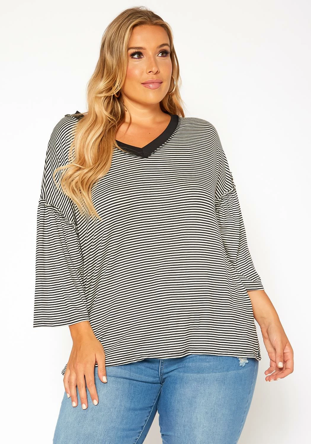 Plus size women’s casual t-shirt in striped pattern, v-neck style, drop shoulder sleeves and relaxed fit.