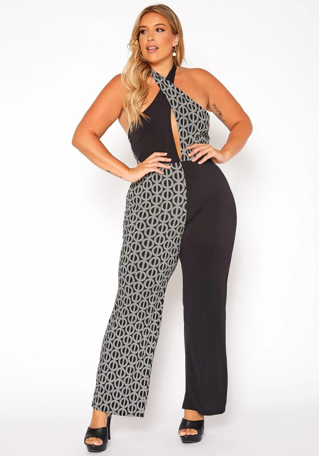 Beautiful plus size women’s jumpsuit in halter neck design, geo print splice, open back style and flare leg hem.