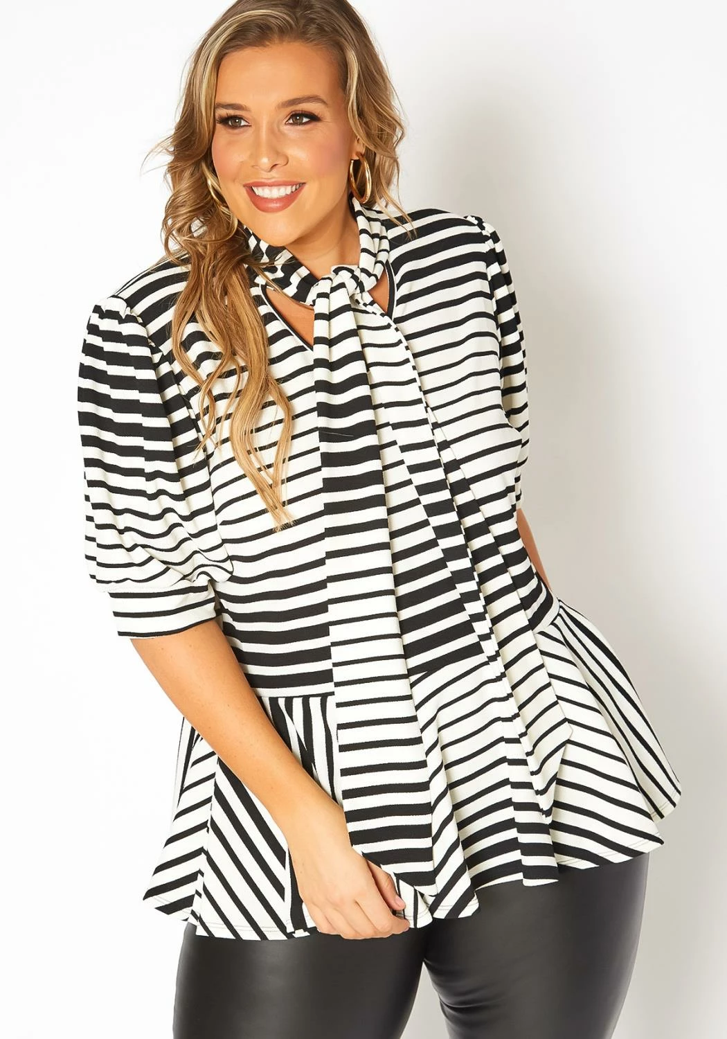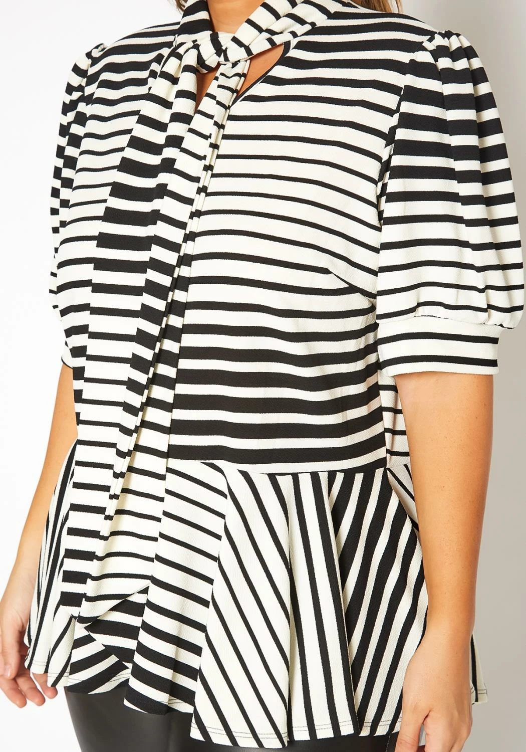 Plus size women’s peplum top in multi striped print, collar tie ascent, puff shoulder short sleeve and cinched waist.