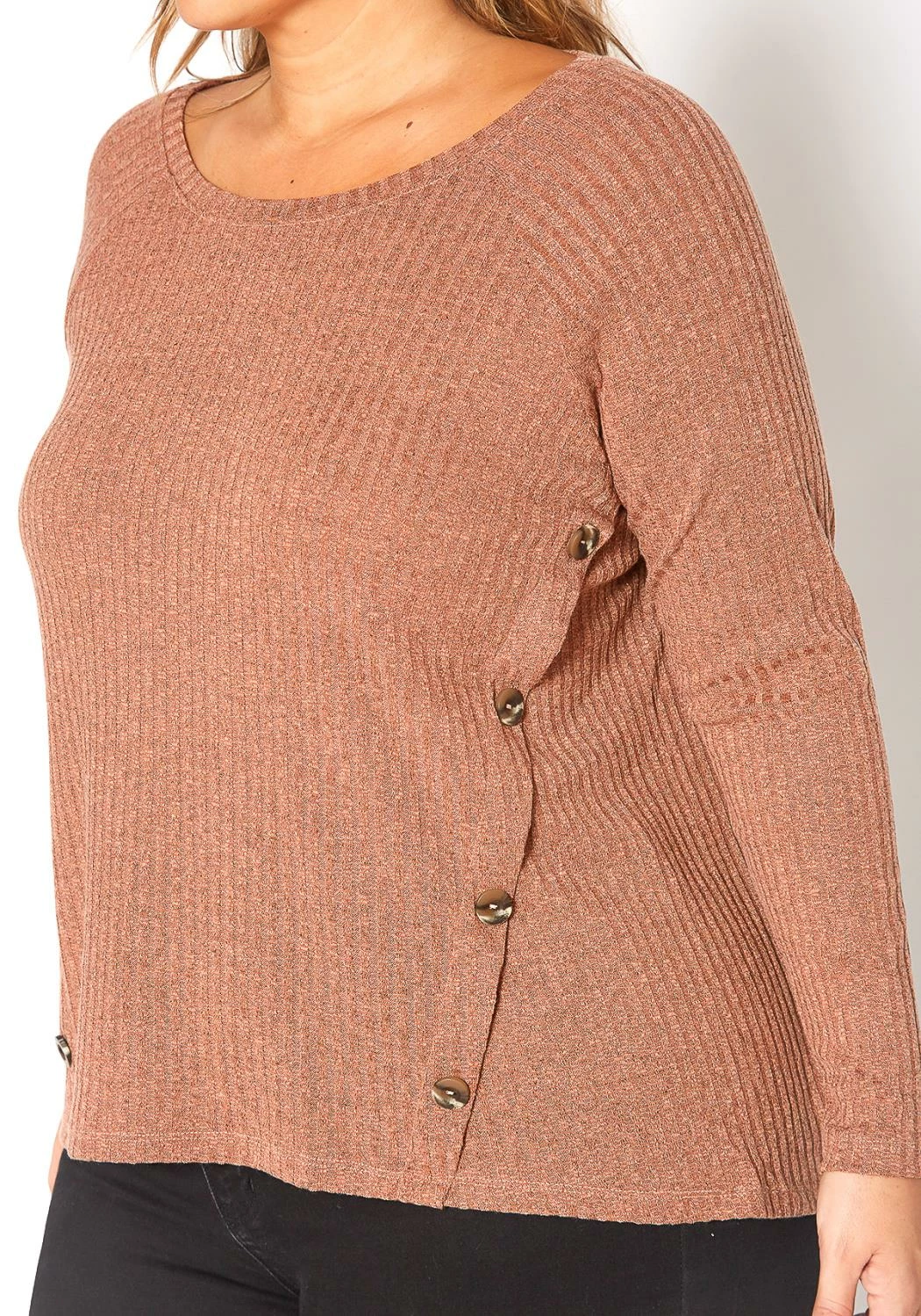Plus size women’s crewneck basic ribbed knit sweater top with side faux button accent.