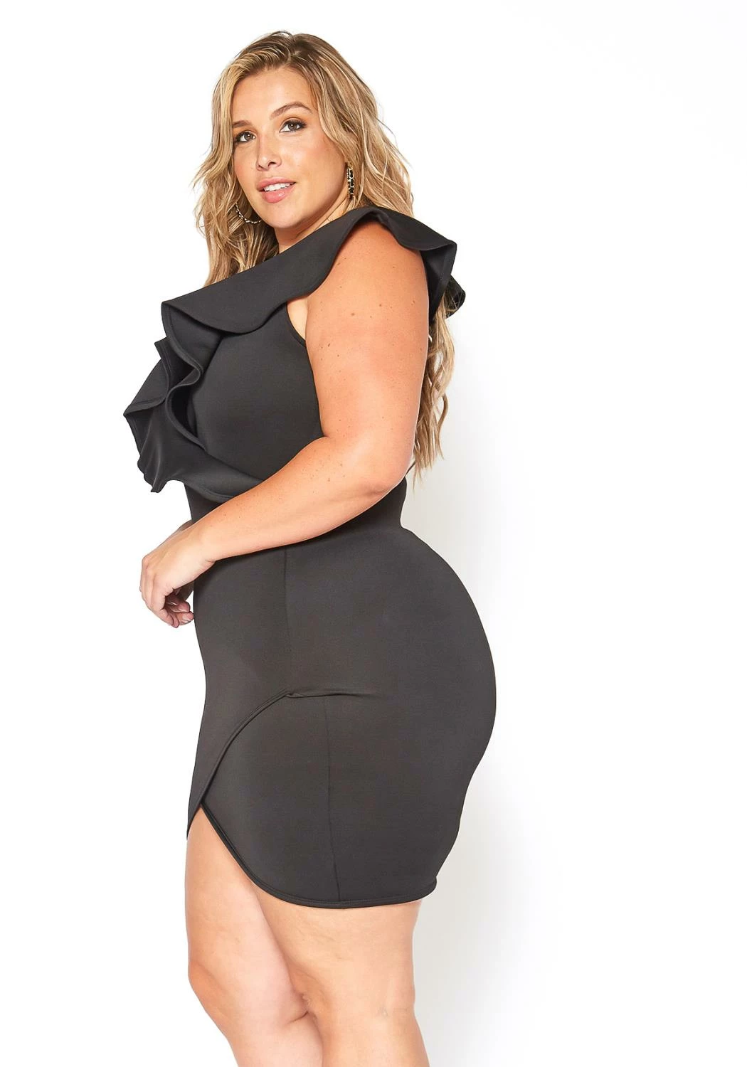 Asoph’s fancy special occasion mini black dress for plus size women which features a ruffle overlay v-neck and asymmetric design front end.