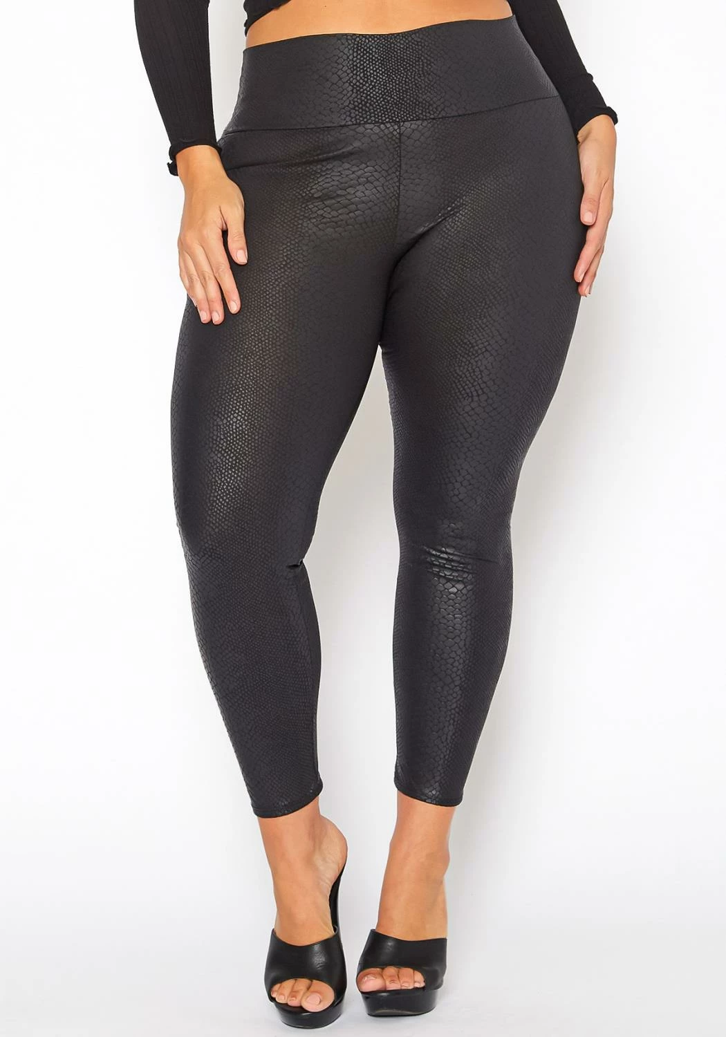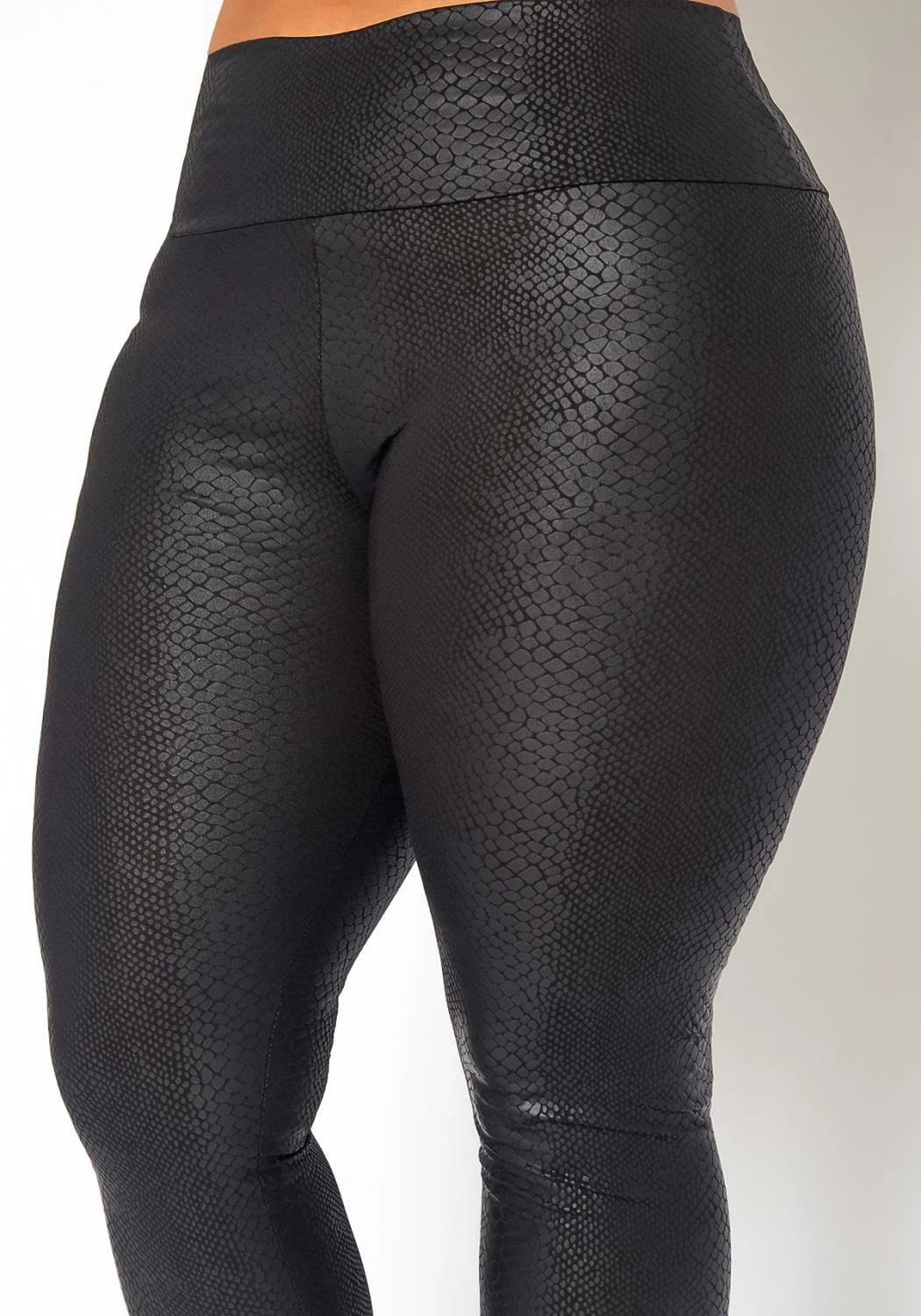 Statement plus size women’s leggings in faux leather snakeskin print, high waist band design and skinny ankle fitting.