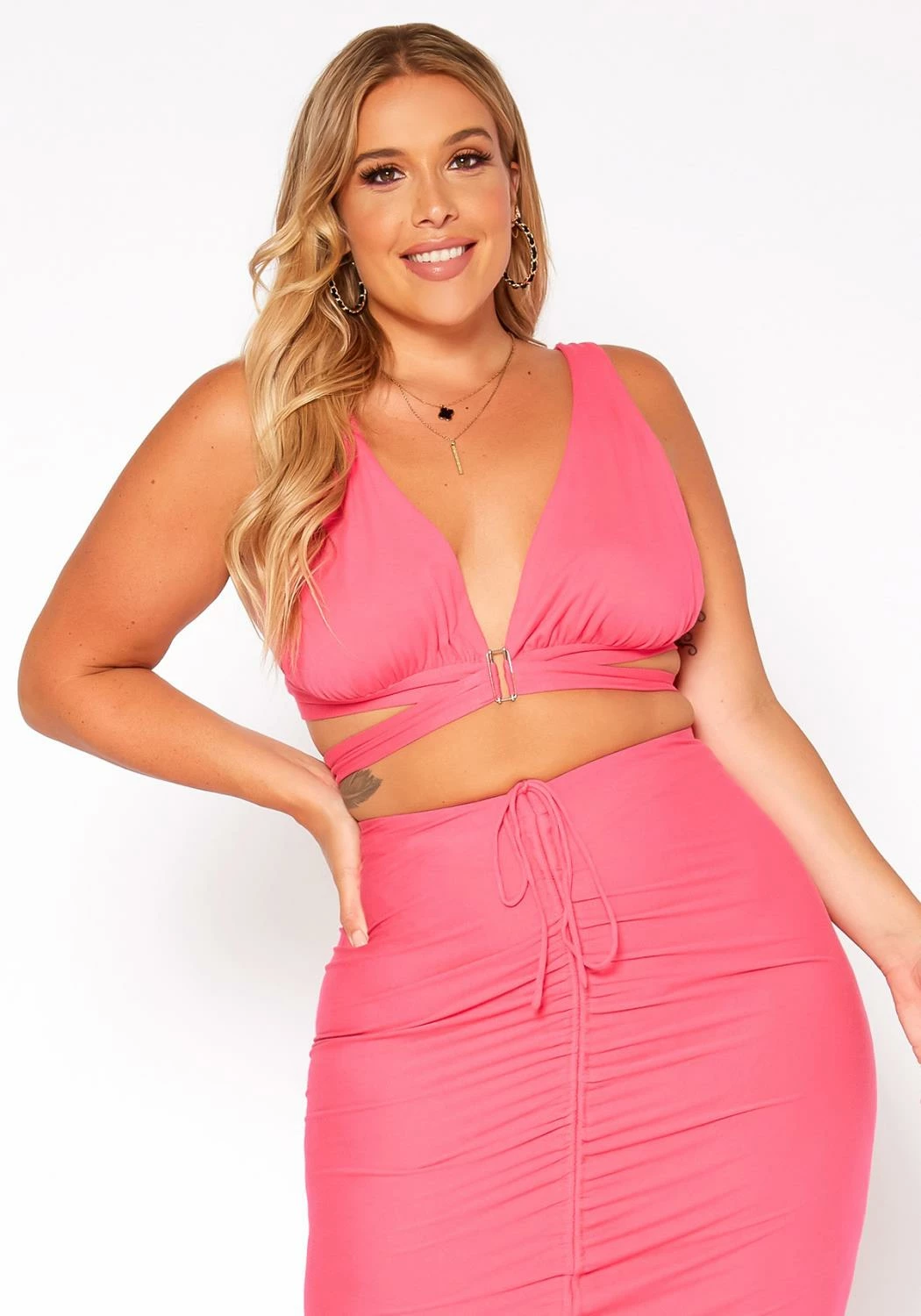 Summer favorite plus size women’s crop top in v-neck style, wrap design, clip front fastening and cami shoulder straps.