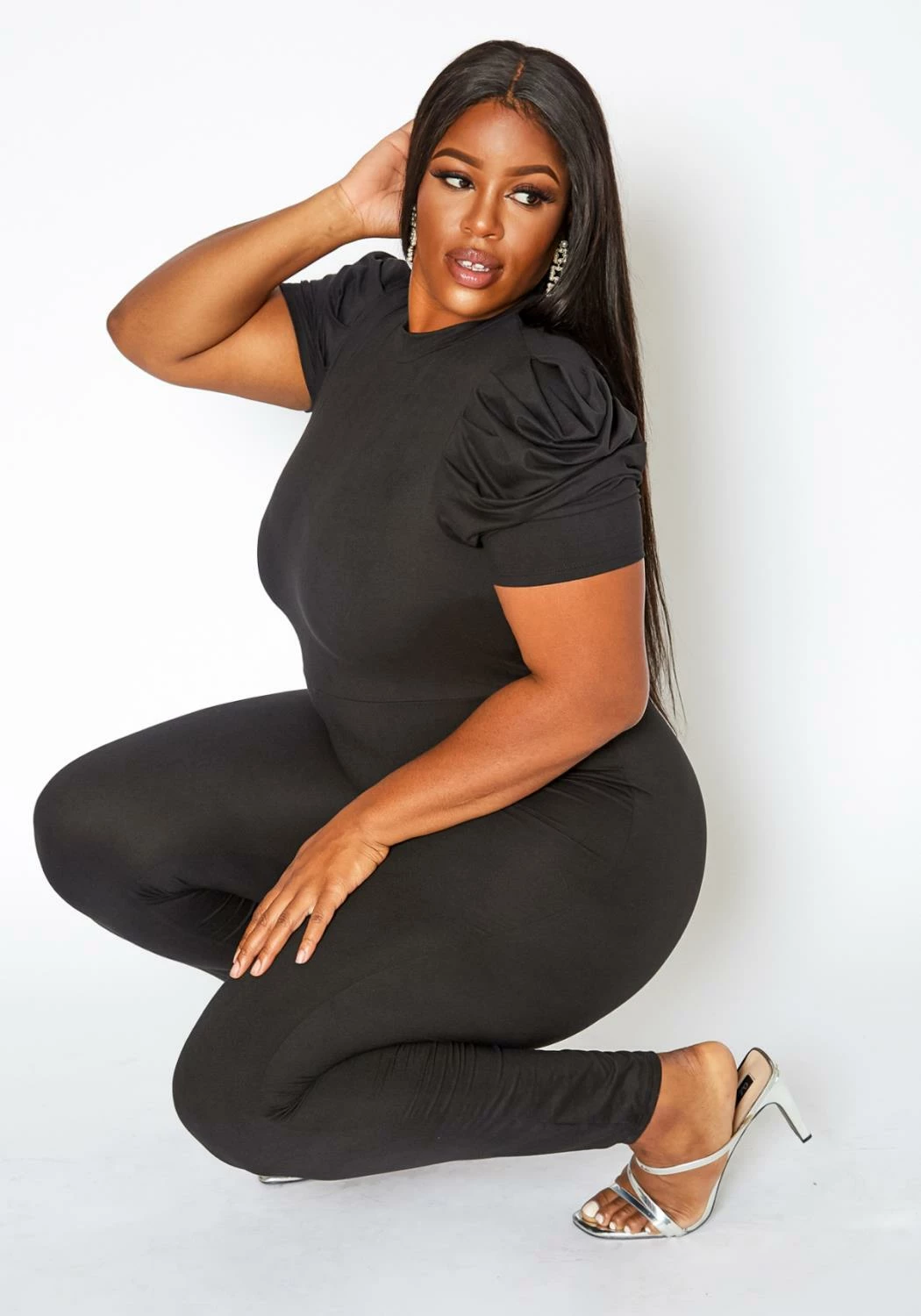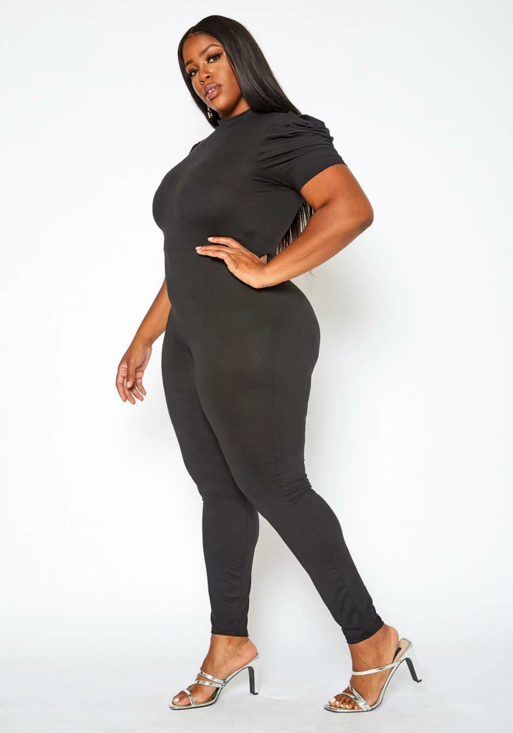 Plus size women’s bodycon jumpsuit in mock neck style, puffy short sleeves and back zipper closure.