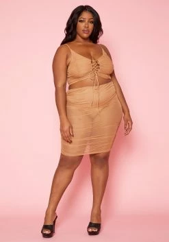 Plus Size Ruched Mesh Crop Top & Mesh Skirt Set