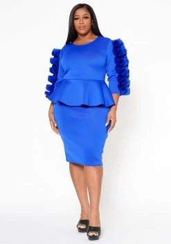 Plus Size Ruffle Sleeve Wrap Blouse & Flare Skirt Set