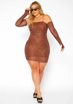 Asoph Plus Size Greek Key Print Bodycon Mini Dress & Glove Set