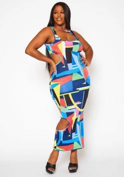 Plus Size Abstract Pattern Cut-Out Midi Dress