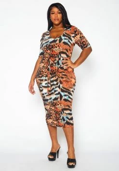 Plus Size Animal Pattern Slinky Midi Dress