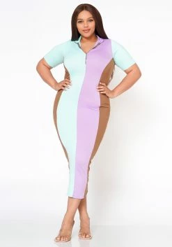 Plus Size Color Block Zip Front Bodycon Dress