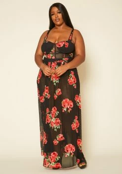 Plus Size Rose Print Sheer Maxi Dress
