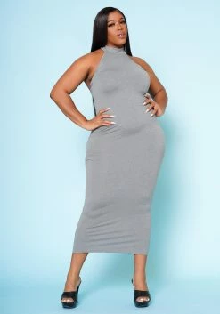 Plus Size Golden Shimmer Halter Neck Midi Dress