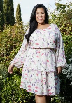 Pleione Plus Size Smocked Waist Ruffle Chiffon Dress