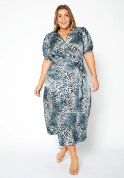 Pleione Plus Size Satin Leopard Wrap Maxi Dress