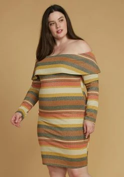 Asoph Plus Size Stripe Off Shoulder Midi Dress