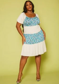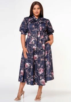 Plus Size Floral Chainlink Print Bow Collar Flare Dress