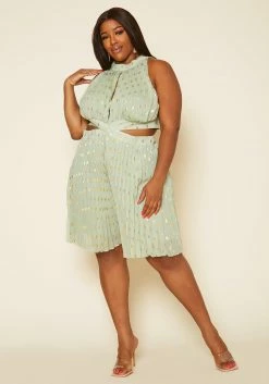 Plus Size Pleated Polka Dot Cut Out Romper