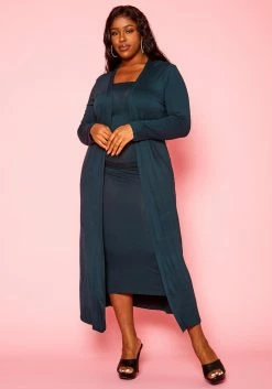 Plus Size Rib Knit Tube Midi Dress & Duster Cardigan Set
