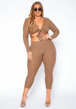 Asoph Plus Size Ribbed Knit Tie Front Crop Top & Legging Set