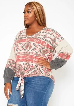 Plus Size Aztec Print Tie Front Sweater