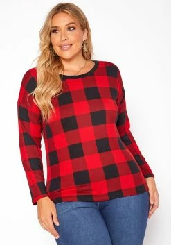 Asoph Plus Size Plaid Print Long Sleeve Top