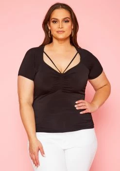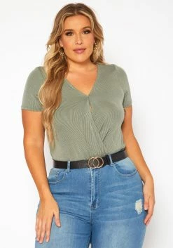 Plus Size Ribbed V Neck Short Sleeve Bodysuit