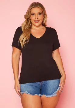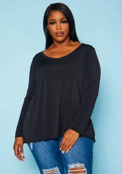 Plus Size V Neck Pocket Hem Long Sleeve Blouse